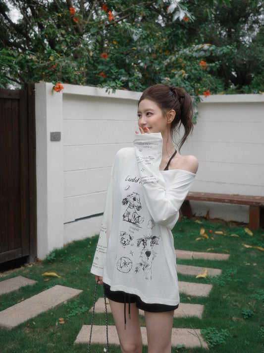 Xie Burou White Printed Off-Shoulder Thin Long-Sleeve T-Shirt Women's Spring/Summer Lazy Loose Casual Versatile Off-Shoulder Top