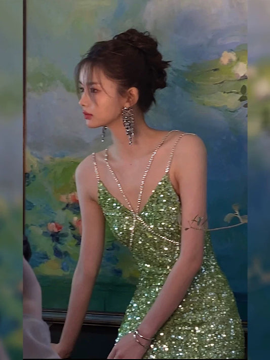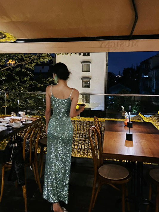 A beautiful, sophisticated, and elegant mint green French-style dress perfect for early summer, perfect for a beach vacation.