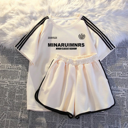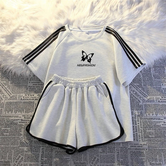 Casual fashion striped short-sleeved sports suit for women summer 2025 shorts two-piece suit loose trendy running to reduce age and make you look thinner