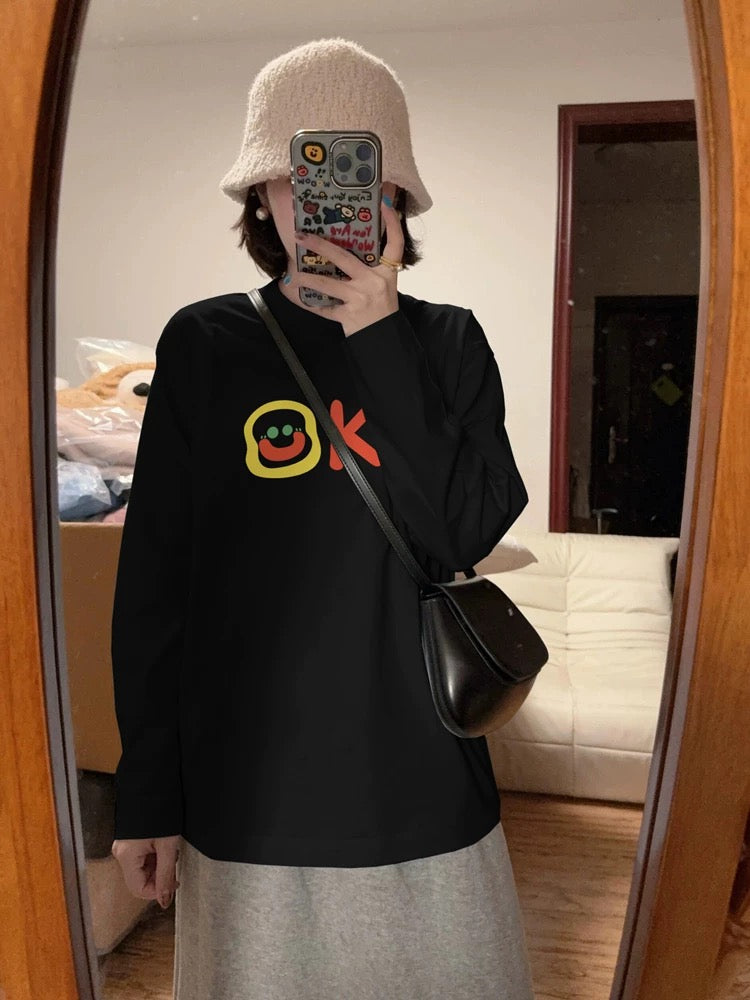 100% cotton American retro Hong Kong style chic straight shoulder long-sleeved T-shirt women's loose lazy niche design top