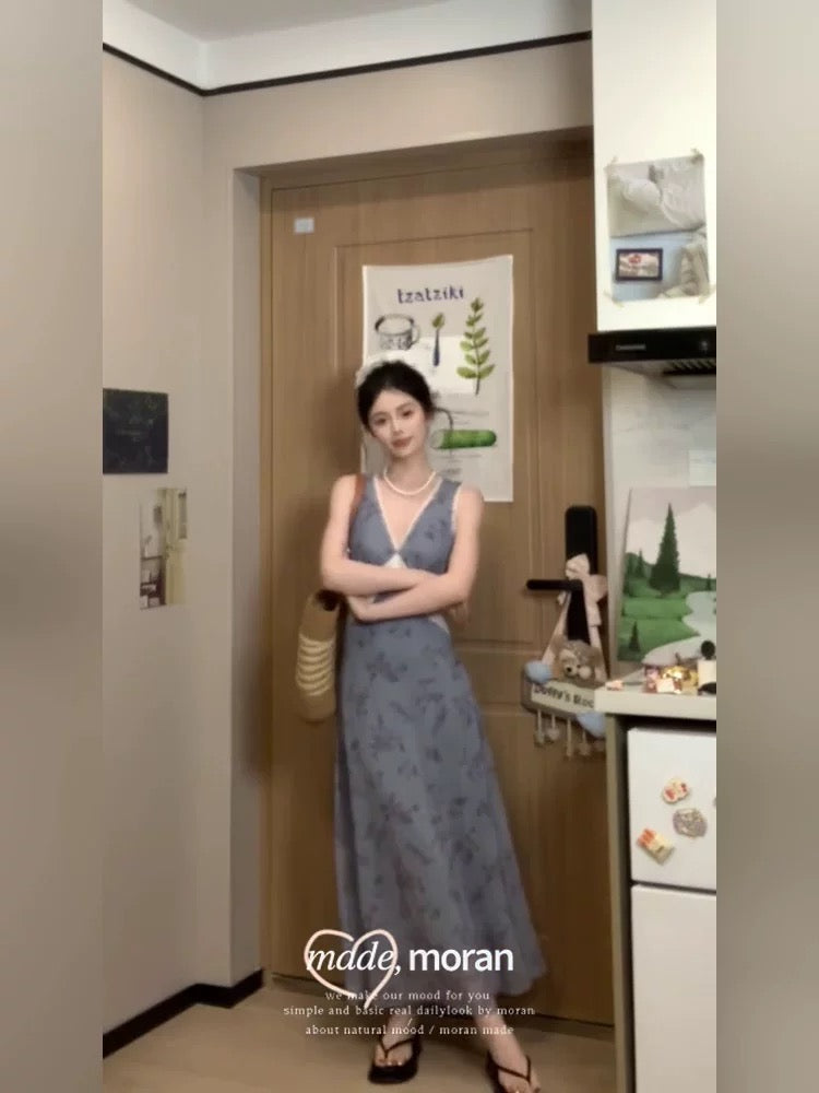 Absolutely gorgeous summer blue floral print dress for women, sweet and spicy V-neck, slimming sleeveless long dress, perfect for beach vacations.