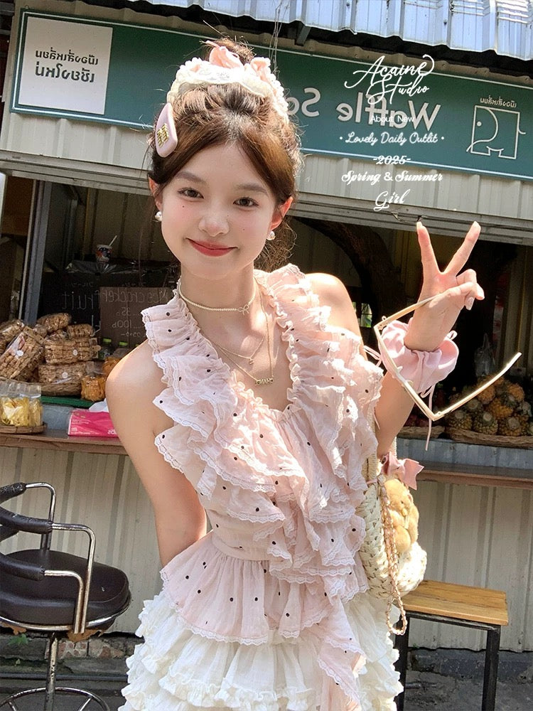 Acaine Ramune Soda / Pink V-neck Polka Dot Halter Vest for Women, Summer French Chic Top