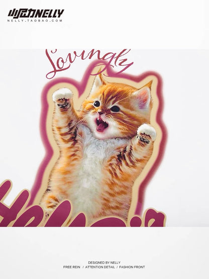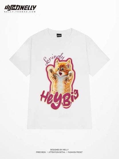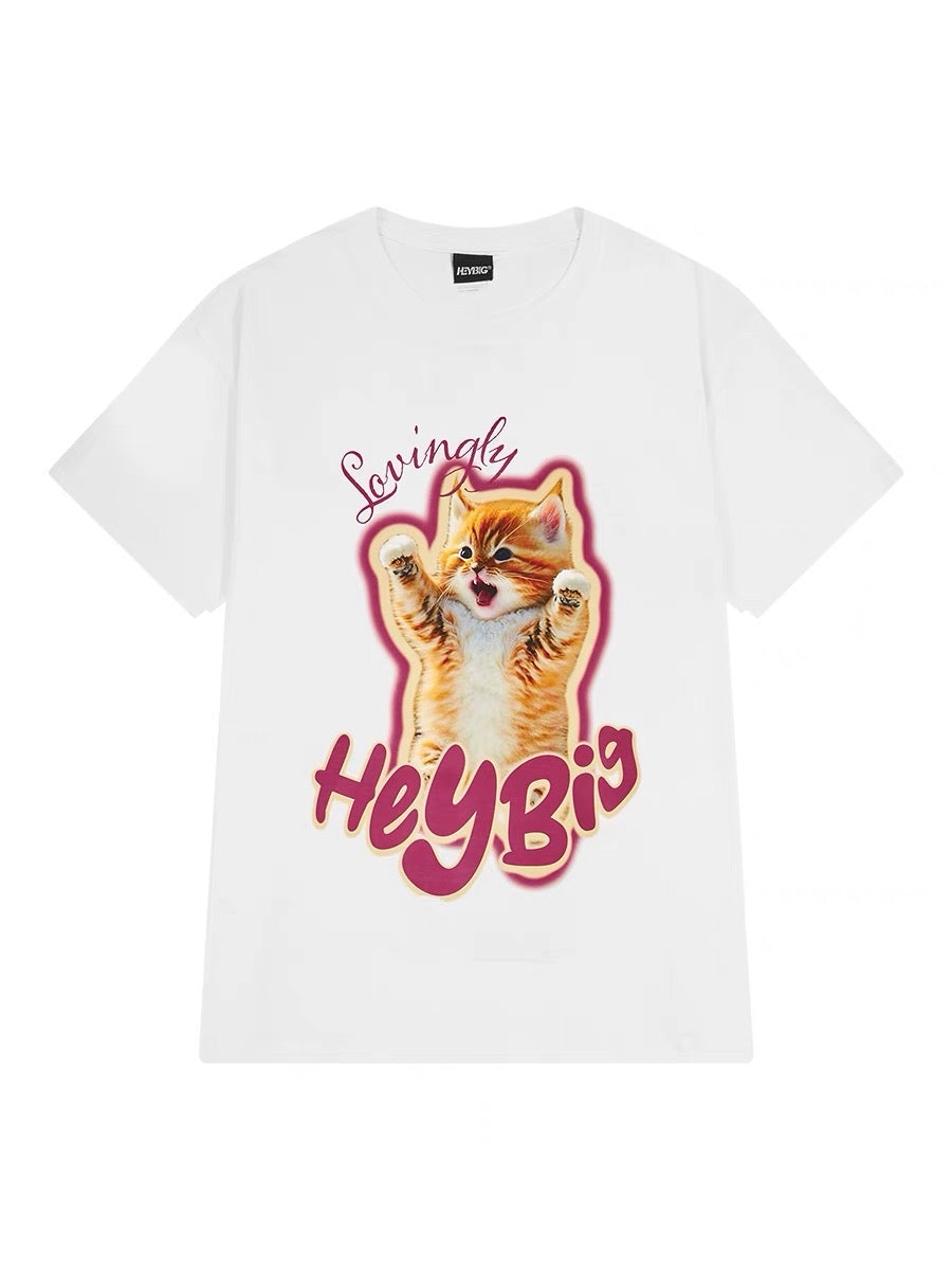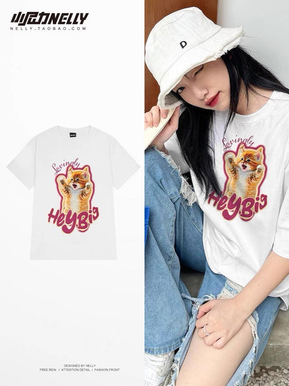 American retro oversize printed cat short-sleeved T-shirts for men and women with different designs for lovers