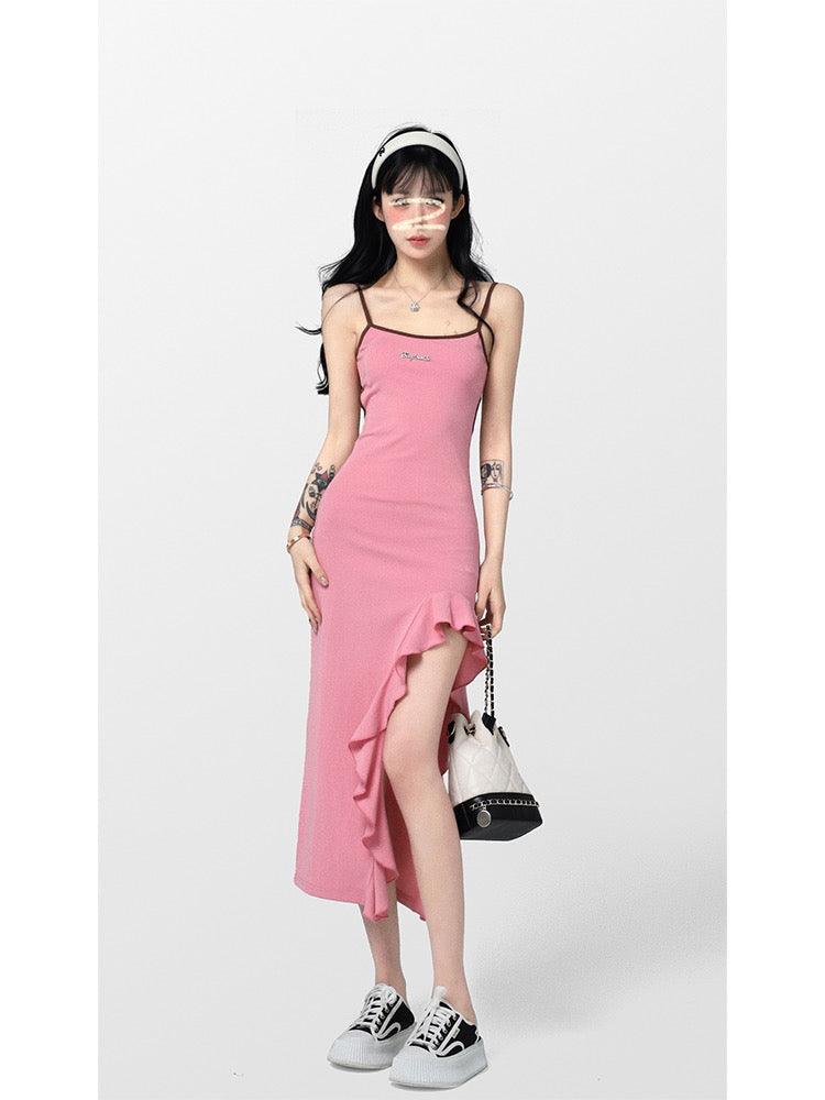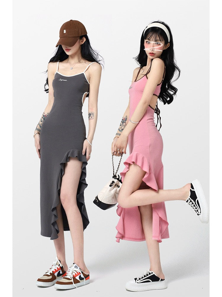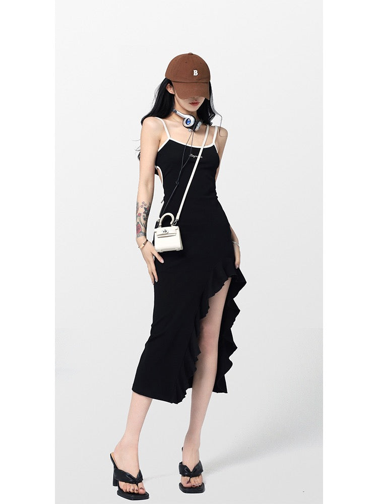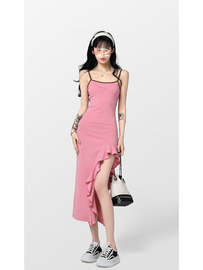 Aunt Barbie American retro hot girl suspender dress female 2023 summer slit back mother skirt bag hip dress
