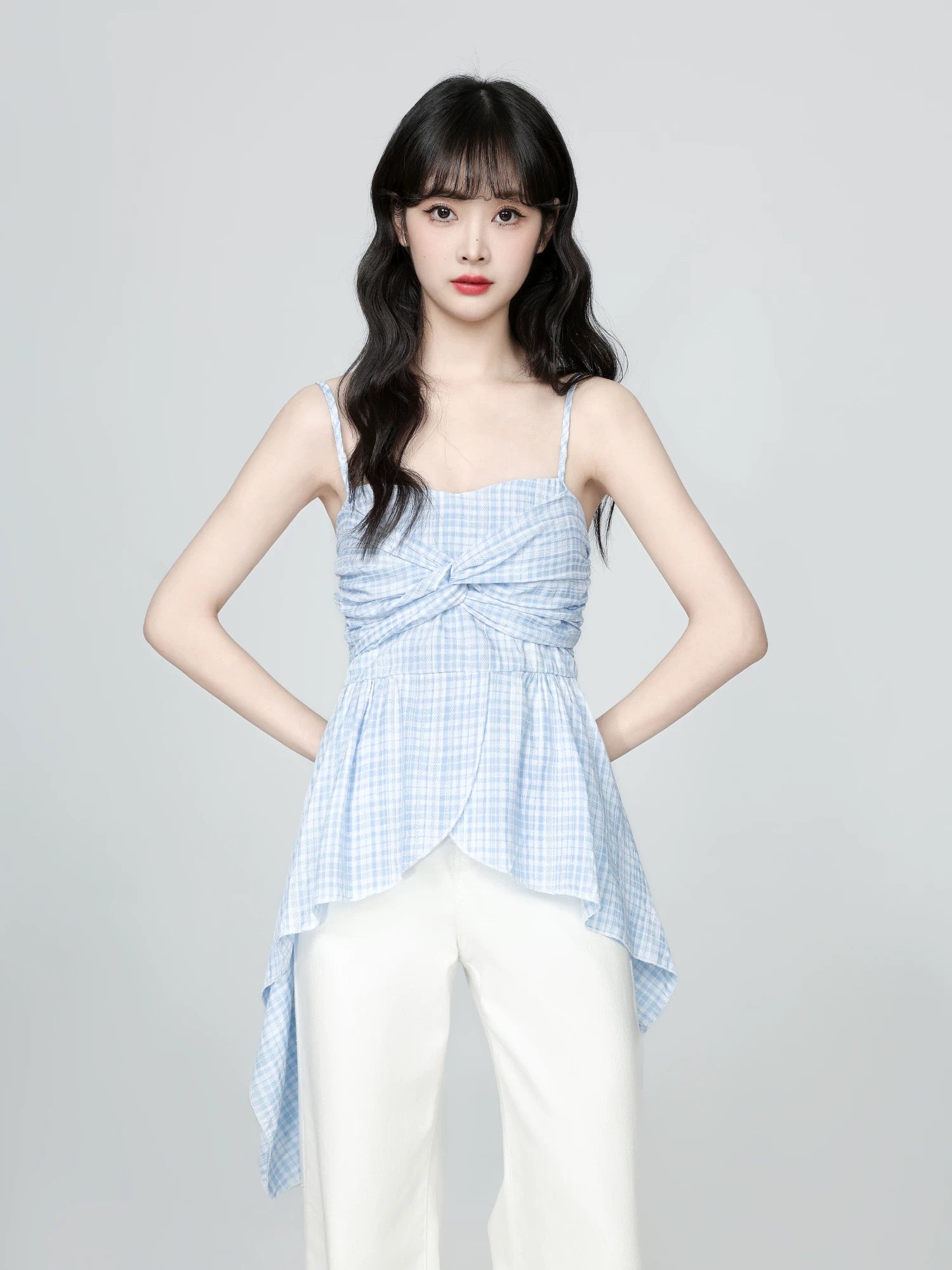 Blue plaid camisole for women summer wear 2025 summer new irregular ruffles twisted sleeveless top