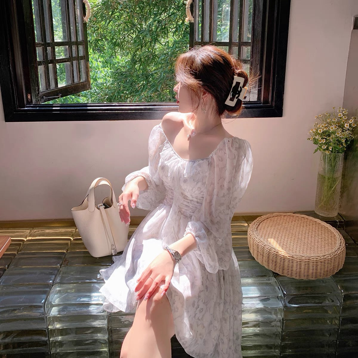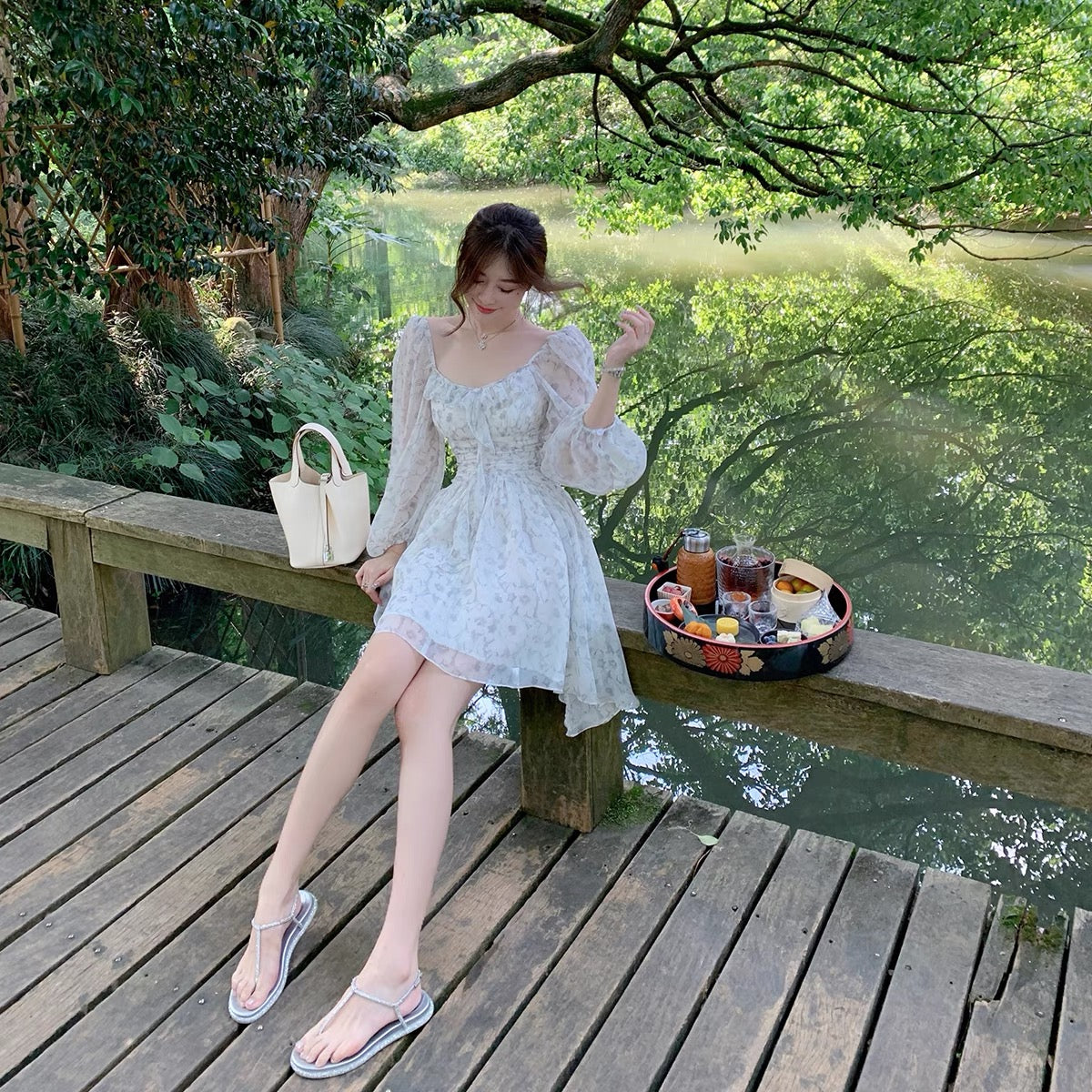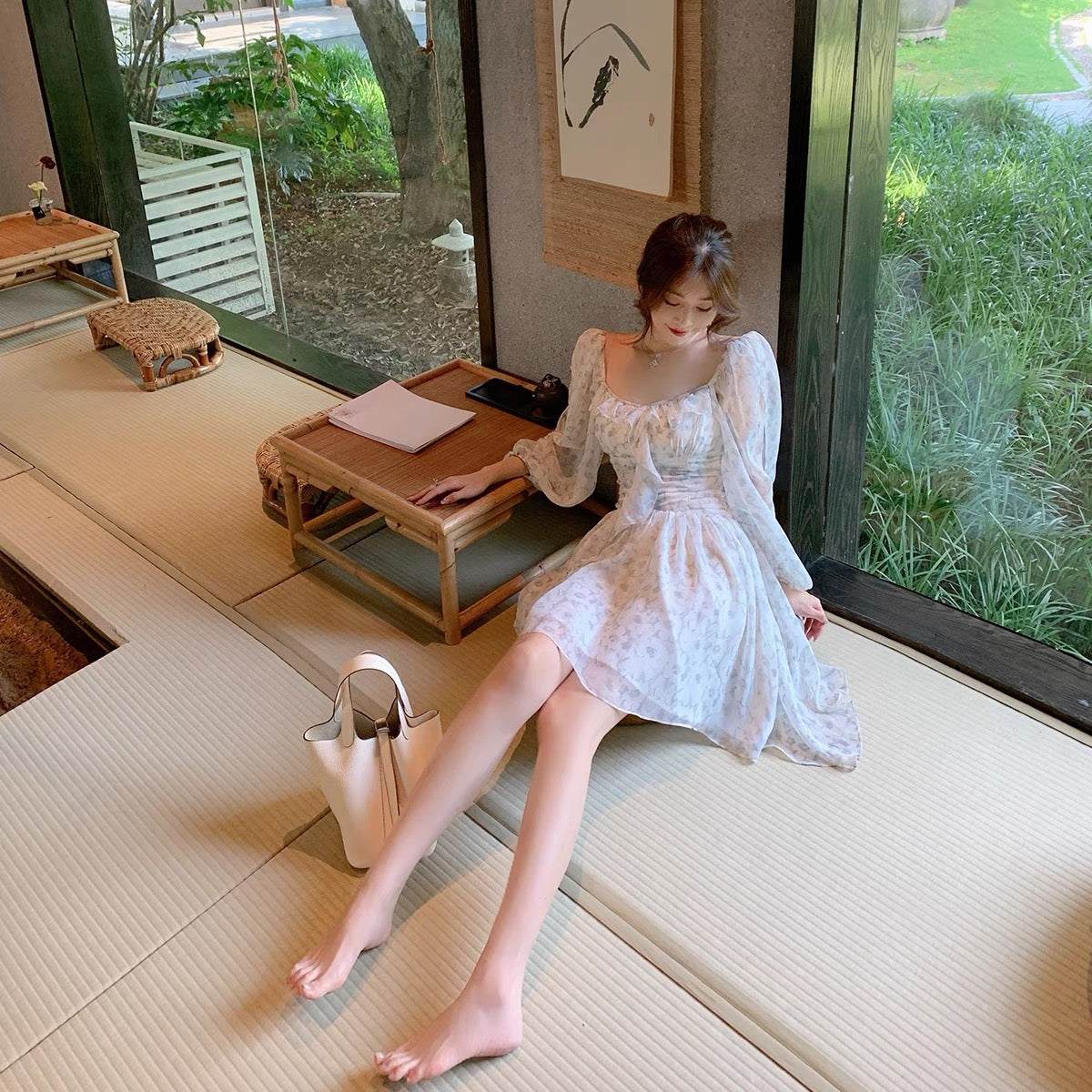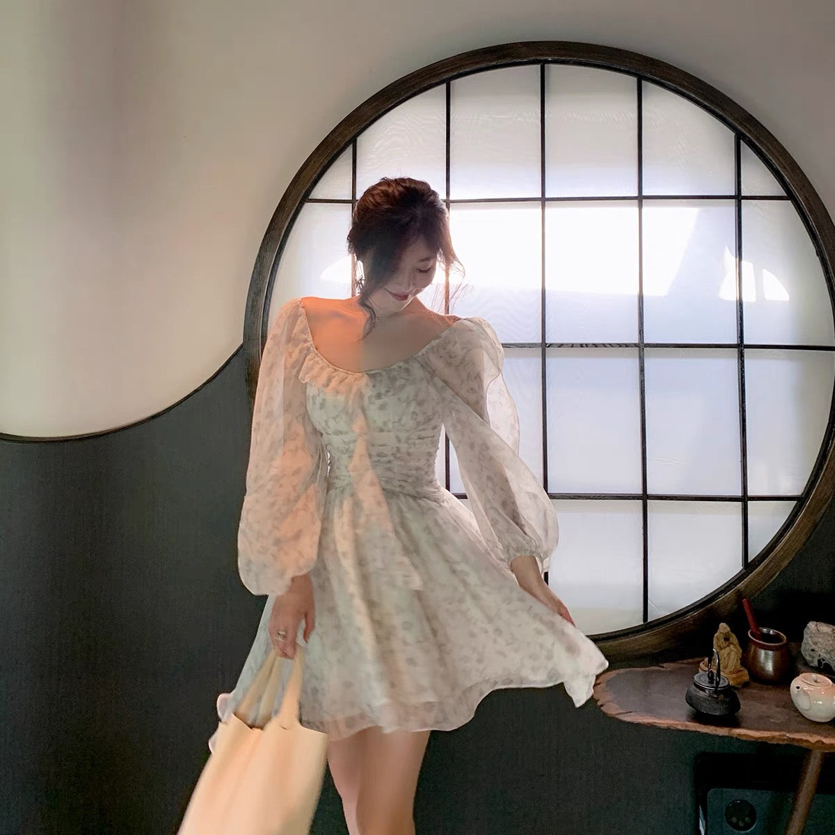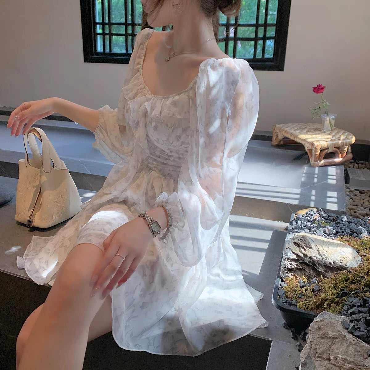 ByYou Summer White Puff Sleeve Floral Dress High Sense Waist Square Collar Small Fresh French Tea Break Skirt 1152