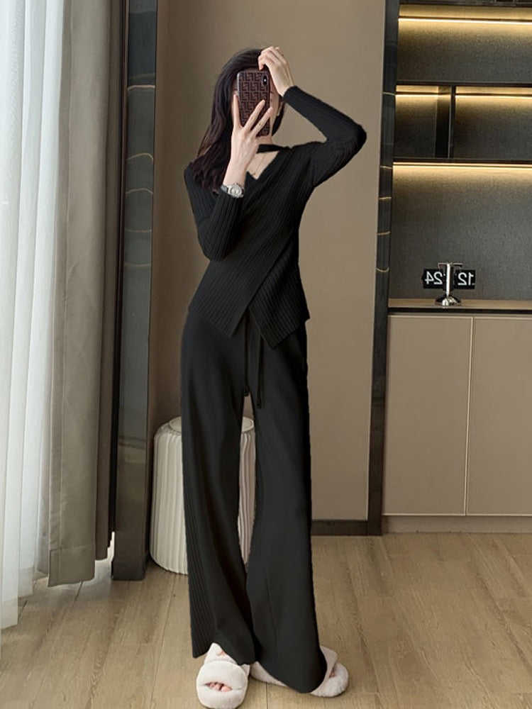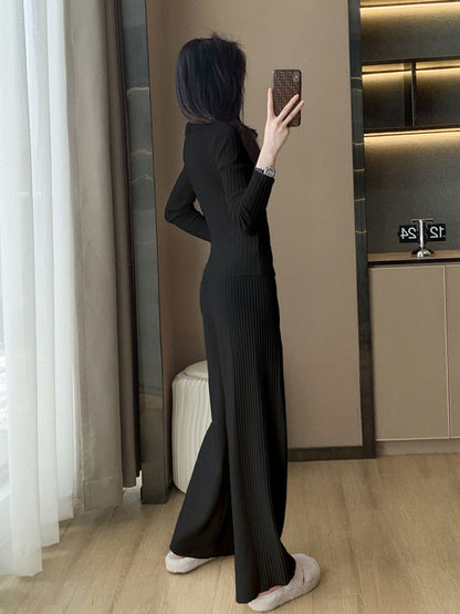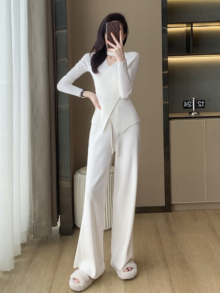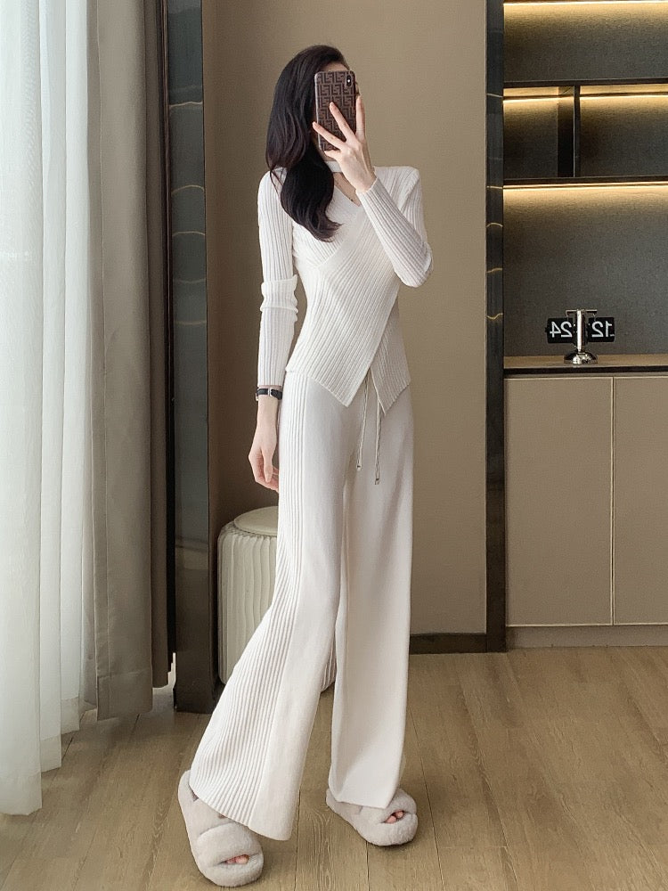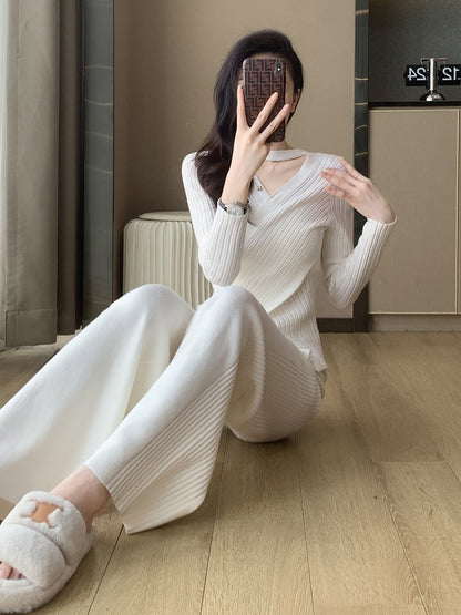 Casual fashion, age-reducing temperament, socialite, slim-fit knitted top, sports wide-leg pants, two-piece suit, female autumn and winter, foreign style