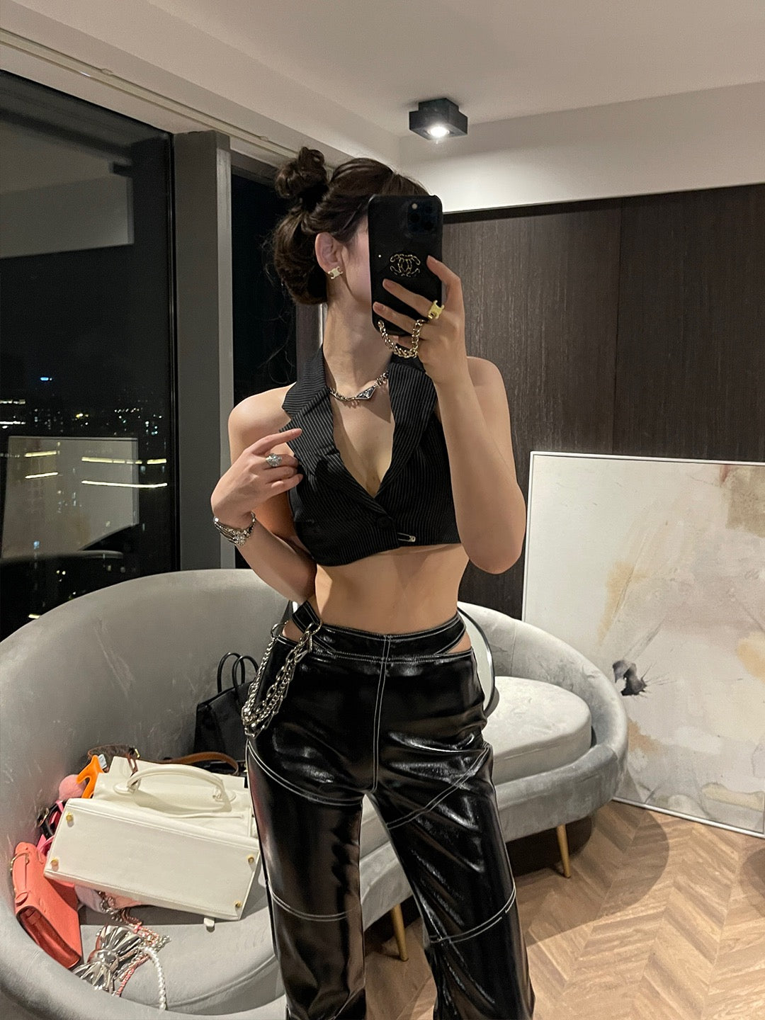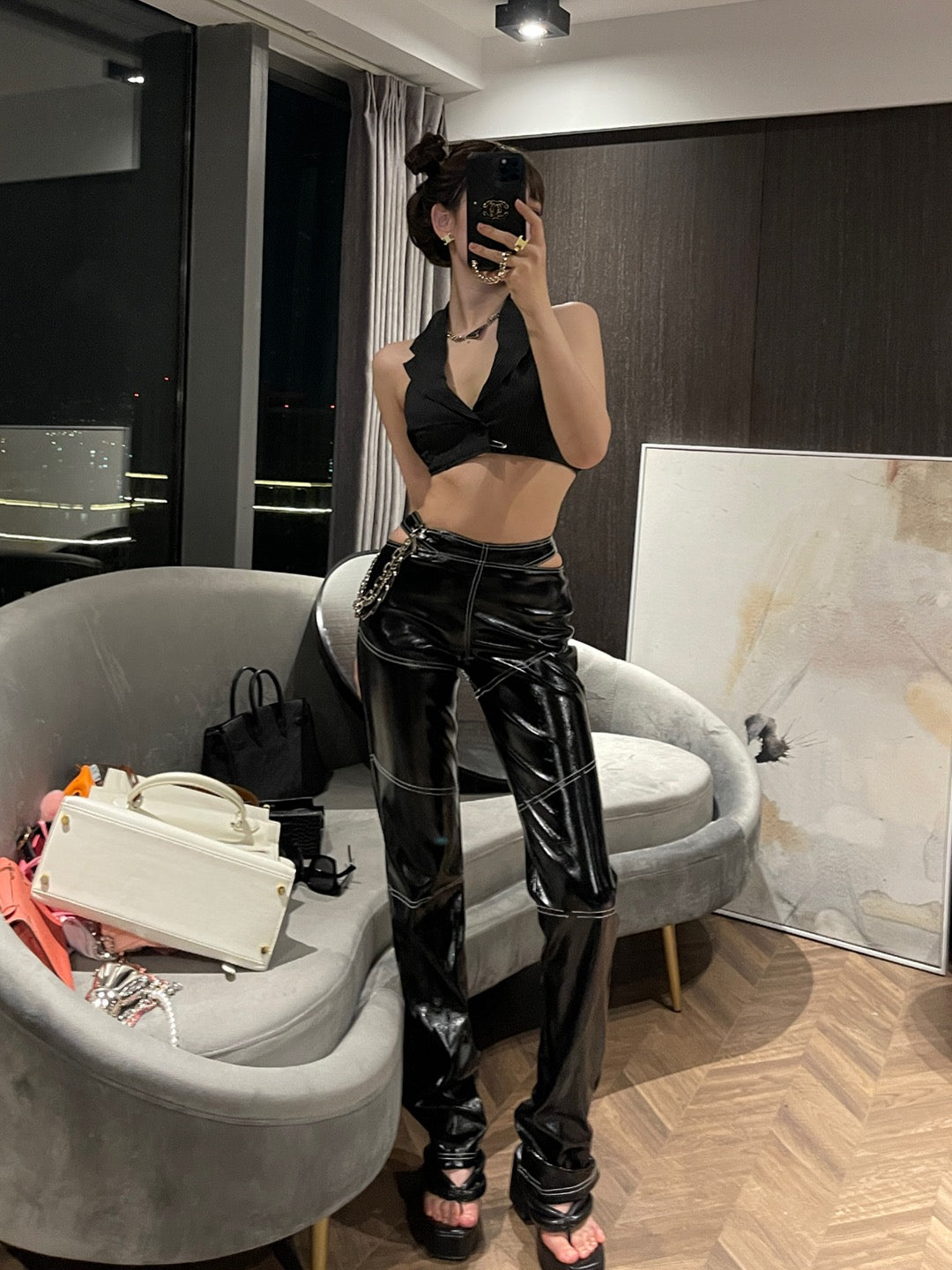 ChiclyNana Sharkskin Pants High Waist Pants Pocket Back Zipper Straight Pants Black Trousers Casual Pencil Pants