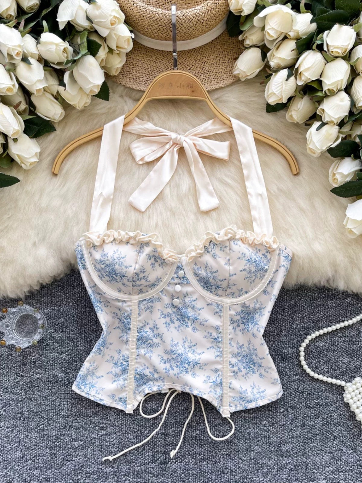 Court-style retro French halter neck lace-up vest women's summer pure and sexy slim-fitting printed strapless top