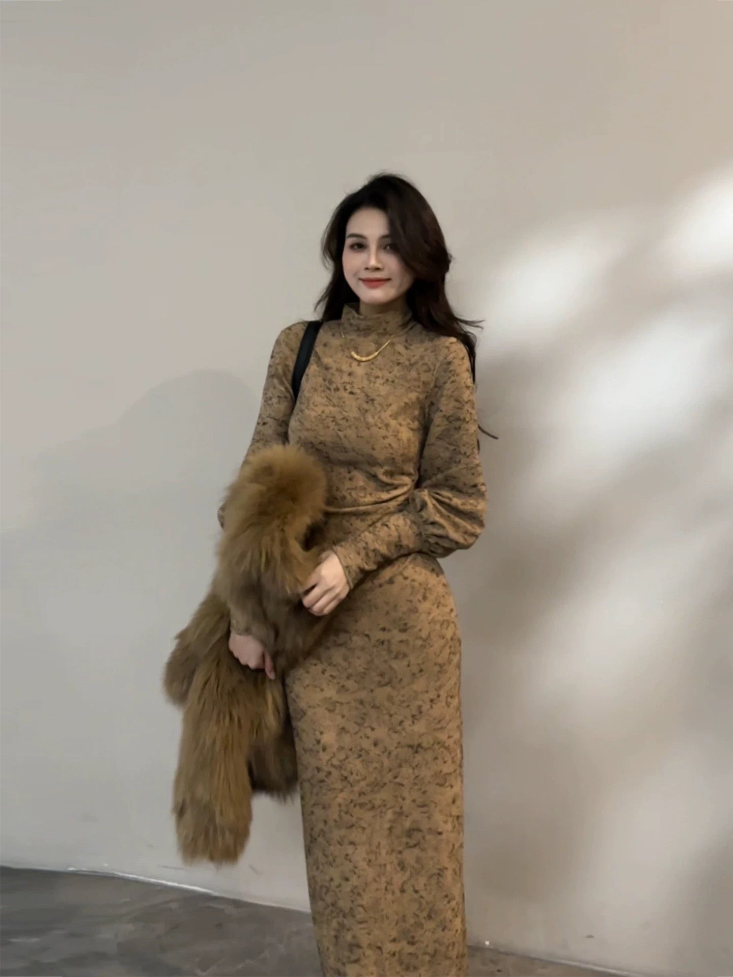 Da Tingting Autumn/Winter New Fashion Floral Lantern Sleeve High Neck Slim Fit Long Dress DT1882