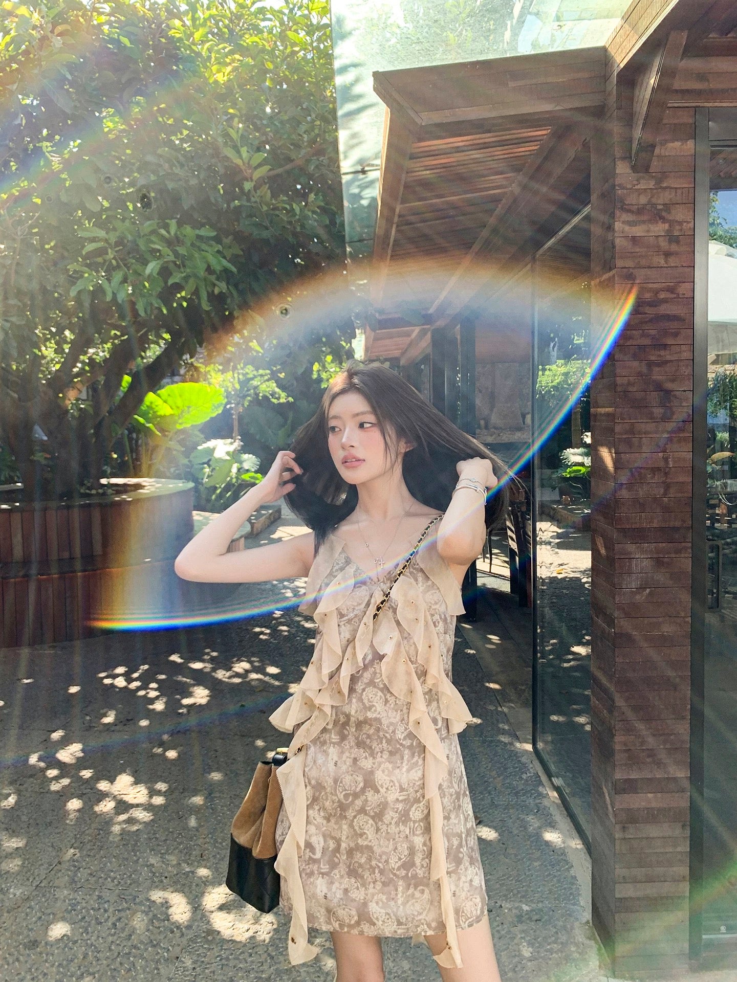 Earth Store French-style niche design vacation-style ruffled dress for women, loose fit, slimming printed suspender dress