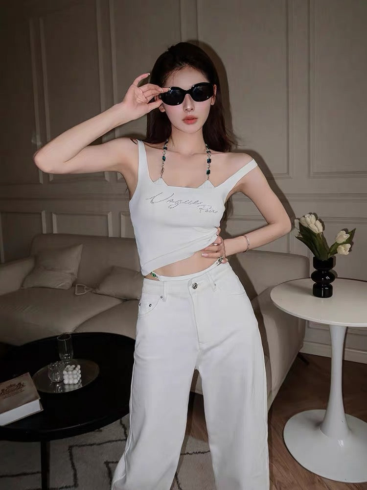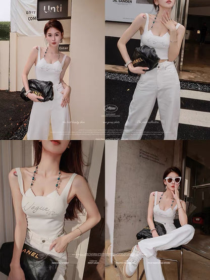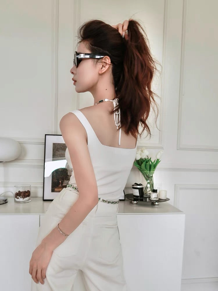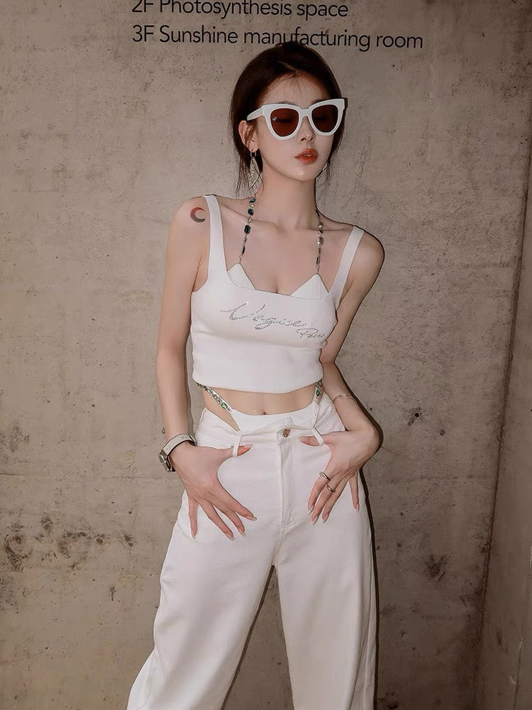 [Earth Store] Sweet hot girl white diamond chain two-piece vest female summer sexy suspender top