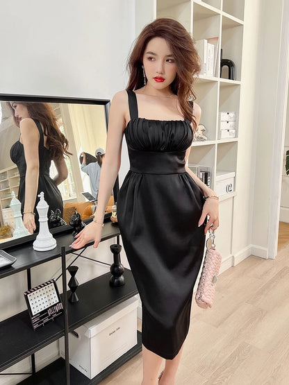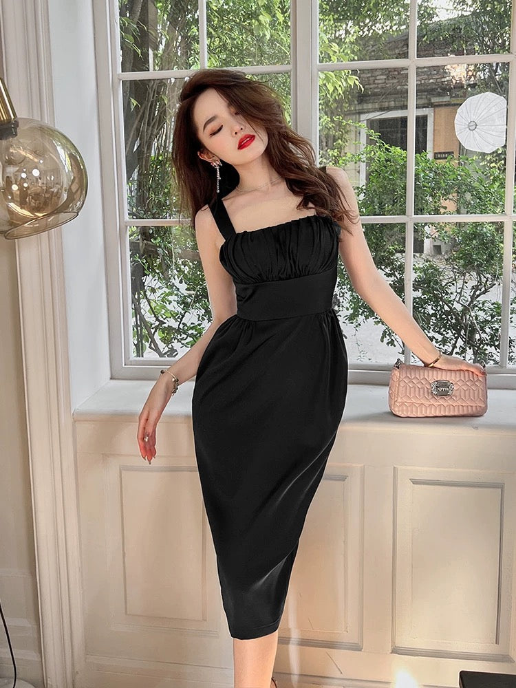 European station black chic Hepburn style bag hip suspender skirt new temperament light luxury waist slim dress summer