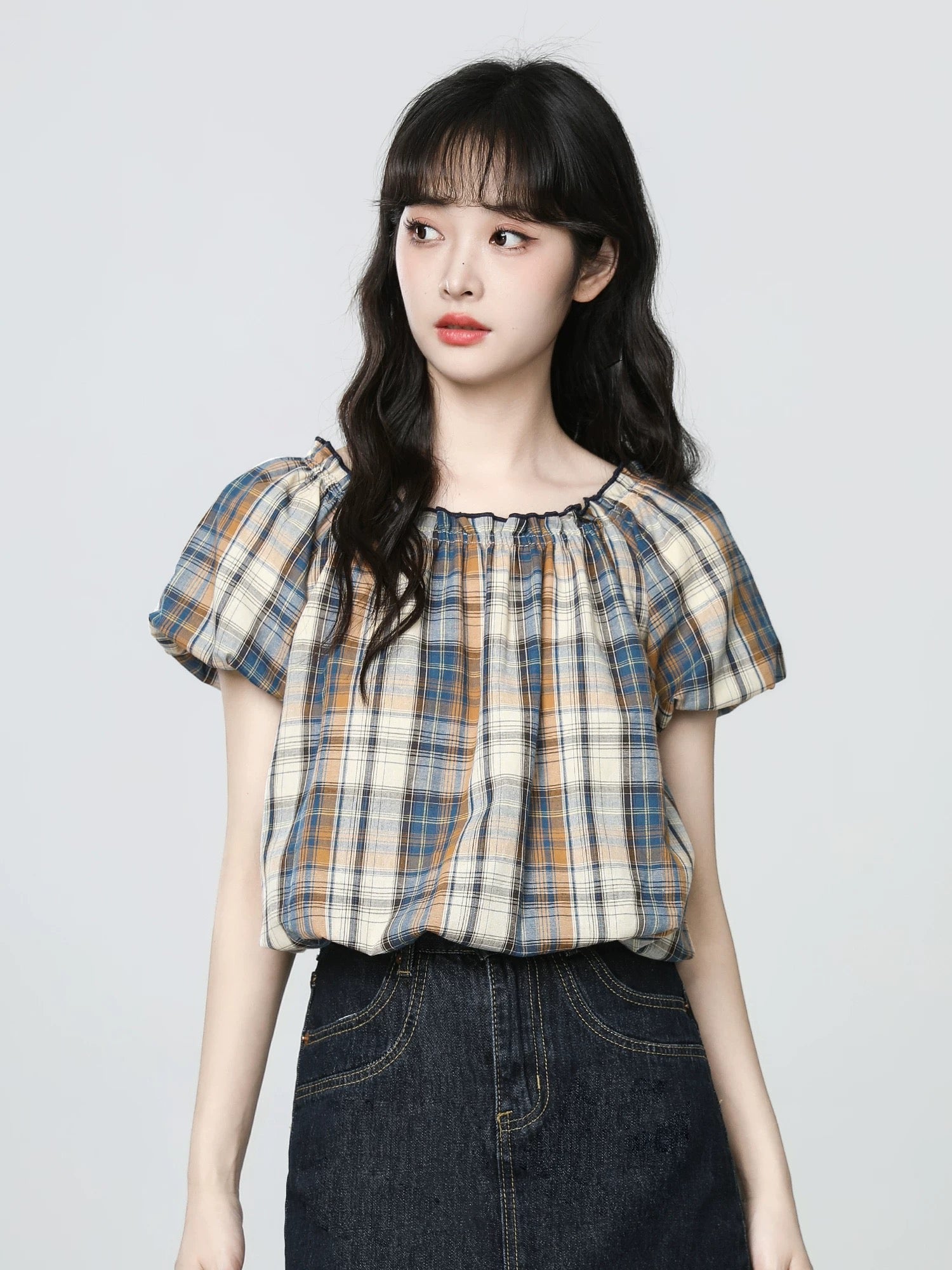 French plaid short-sleeved shirt for women summer 2025 new style niche design puff sleeve shirt short top