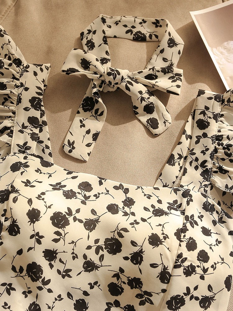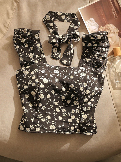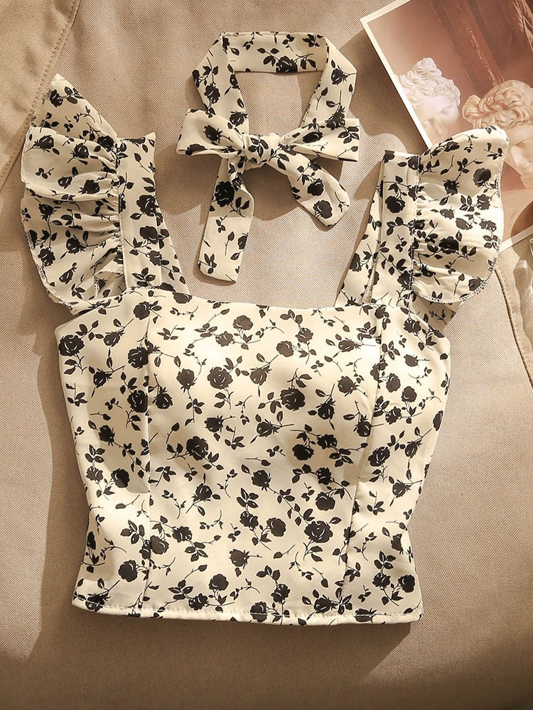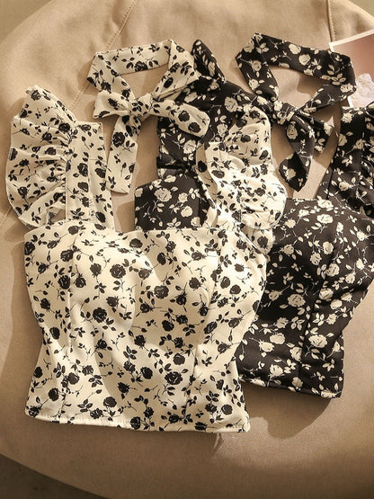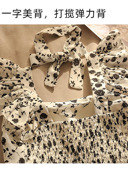 French retro chiffon floral camisole feminine hot girl slim fit with chest pad short sleeveless top
