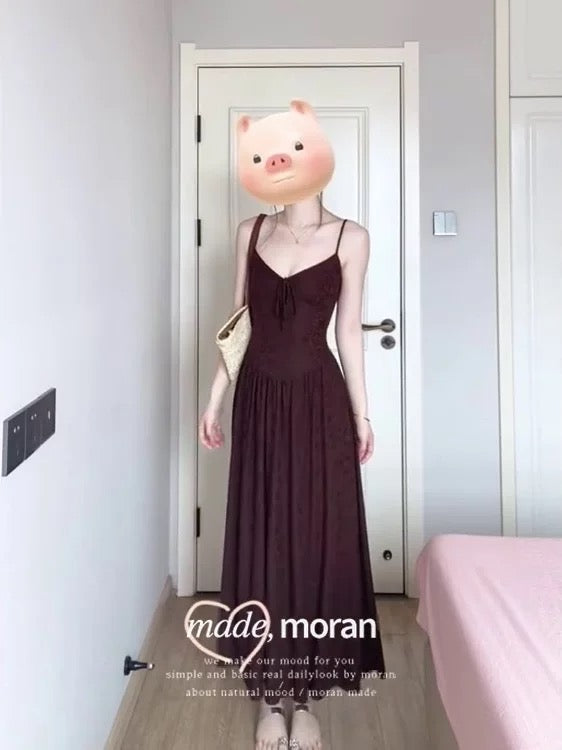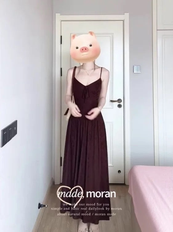French retro-style sophisticated jacquard waist-cinching dress for summer, super beautiful and slimming spaghetti strap maxi dress.