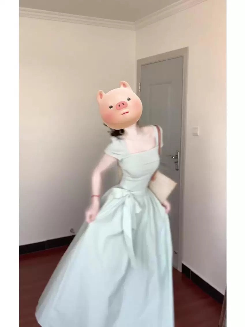 French-style fresh blue short-sleeved square neck dress, perfect for summer, with a beautiful bow, slimming waist, and elegant long dress.
