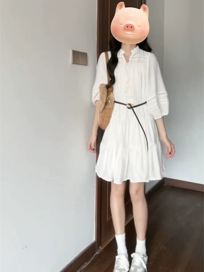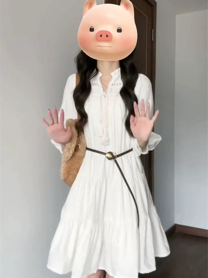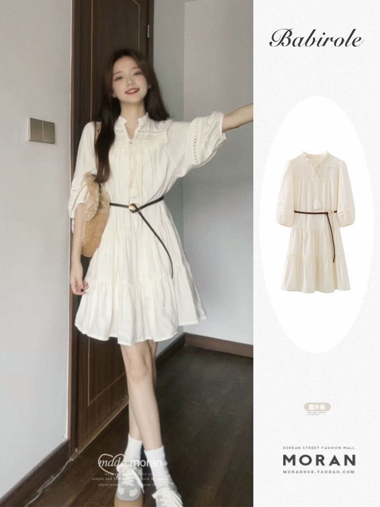 French Tea Break White Lace V-neck Belt Hollow Dress Women's Summer Waist Slimming 2025 Early Spring New Style