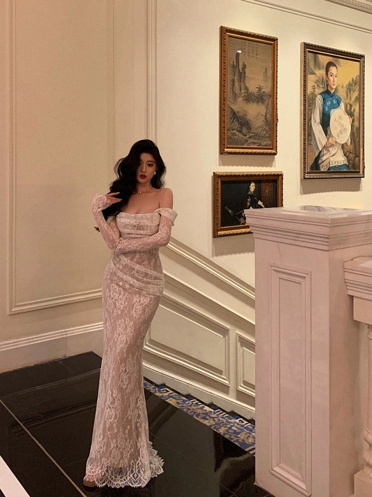 Godfrey lace fishtail long-sleeved dress for women 2024 spring new style pure lust temperament slim hip-covering long skirt