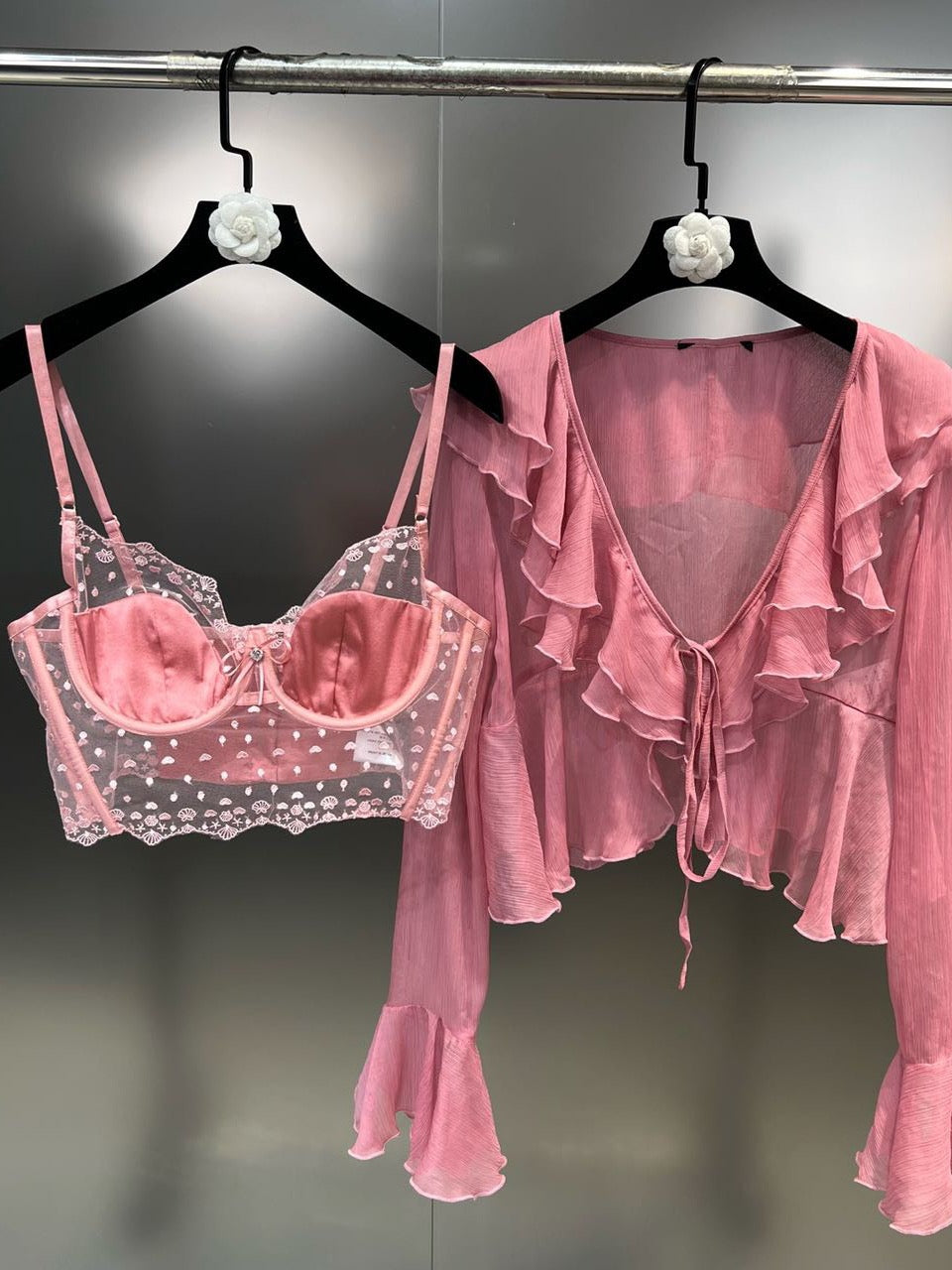 Grapefruit MM 2023 spring ruffled V-neck long-sleeved shirt with lace polka-dot suspenders pure desire style two-piece set
