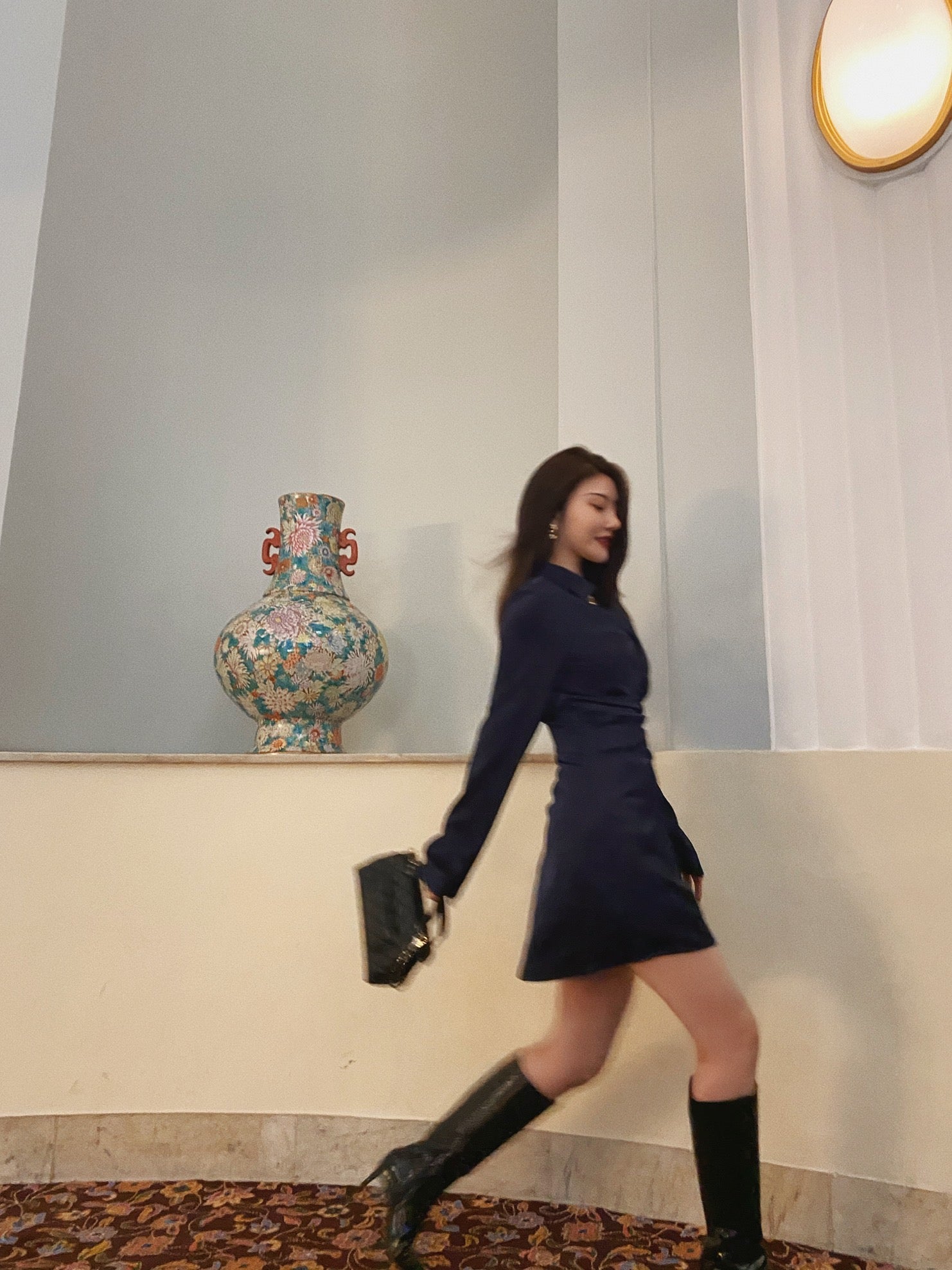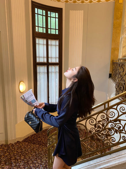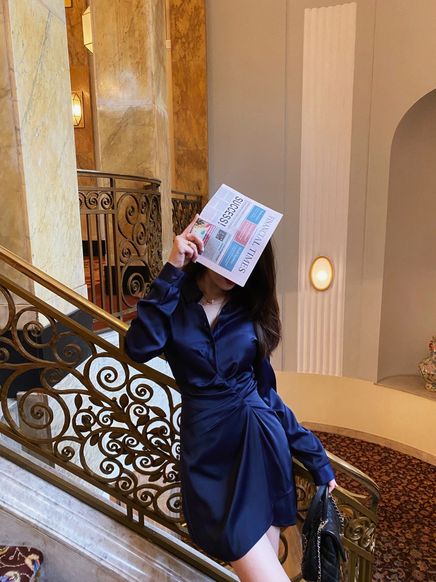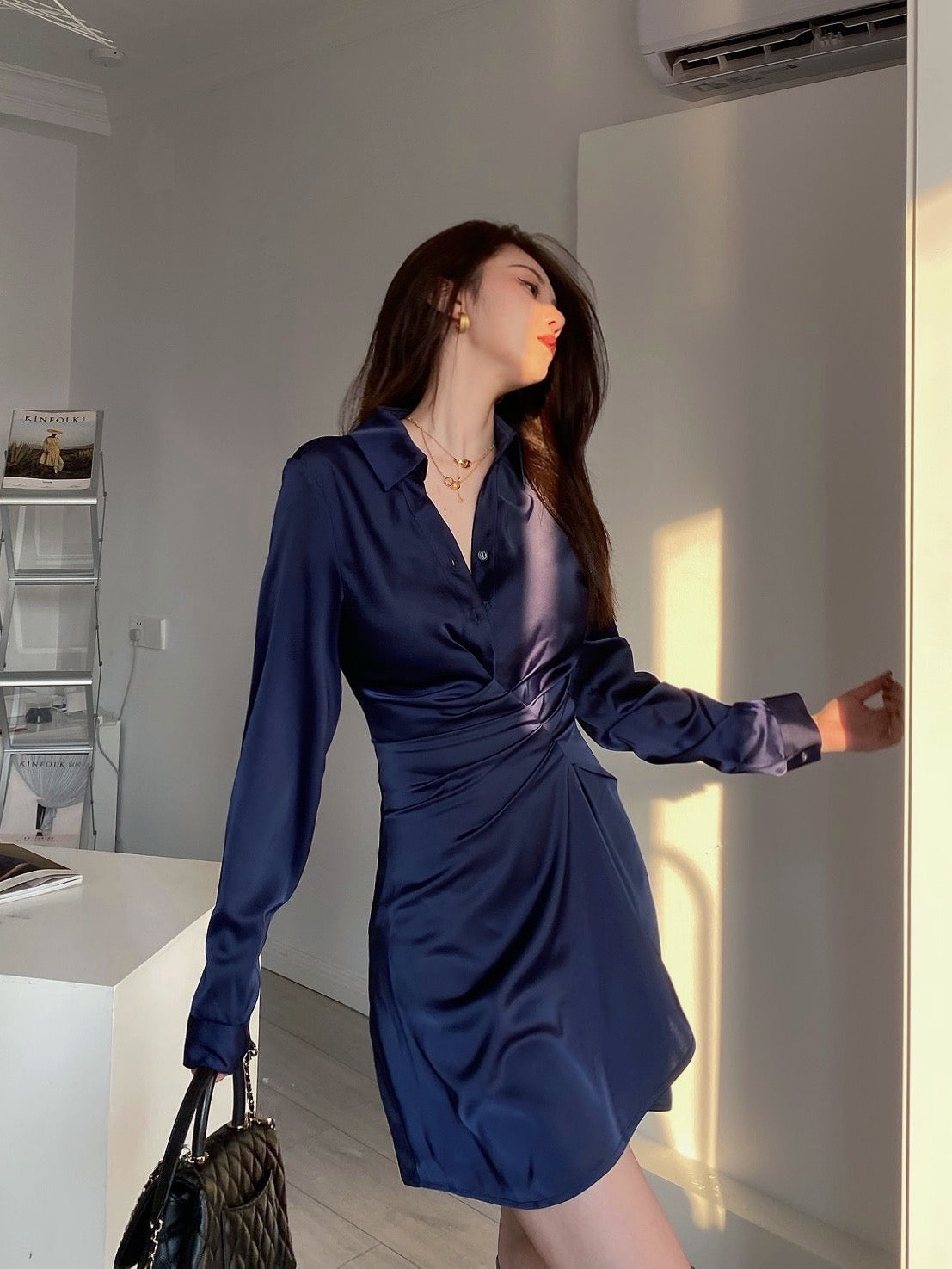 HBE Shui Ge starry sky blue glossy slim waist sexy bag hip long-sleeved shirt skirt shirt dress female