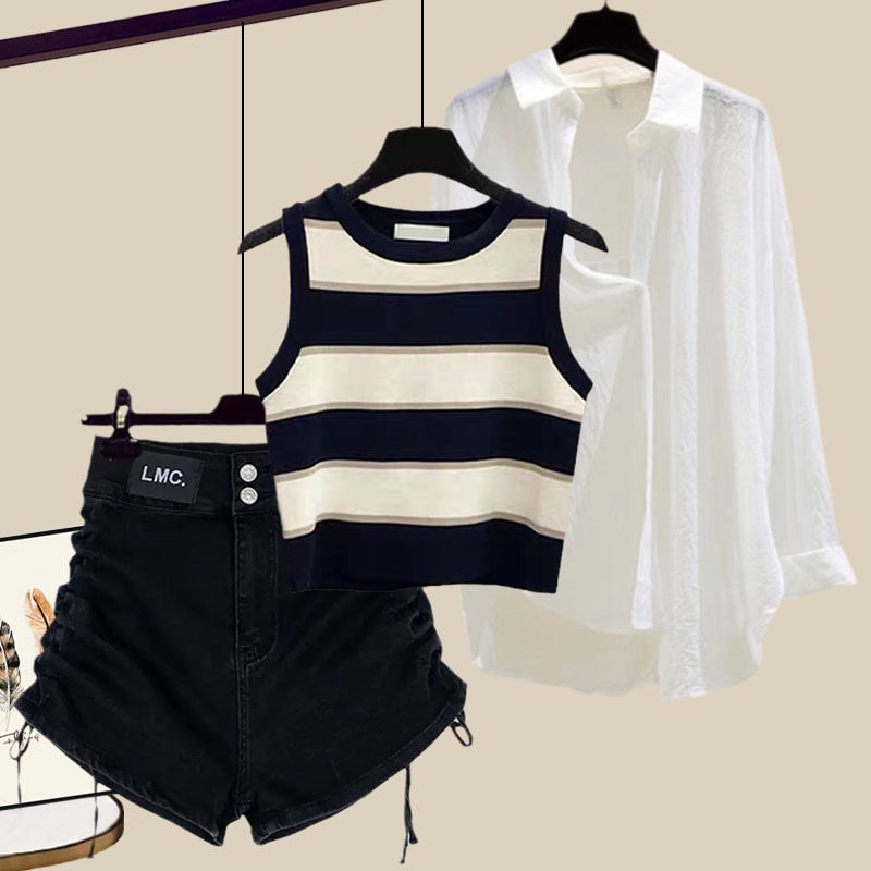 High-end summer three-piece suit female summer hot girl striped vest sunscreen thin shirt wide-leg denim shorts