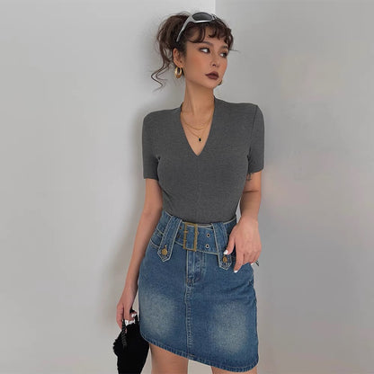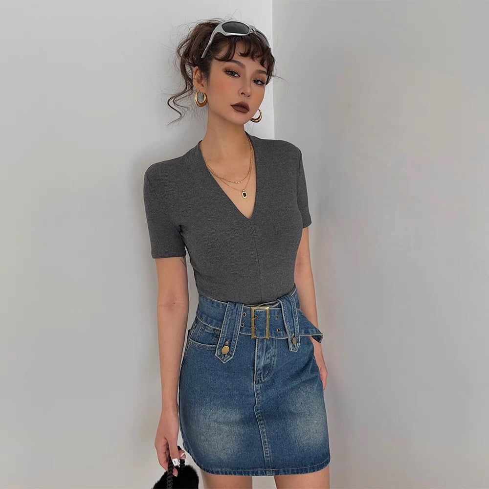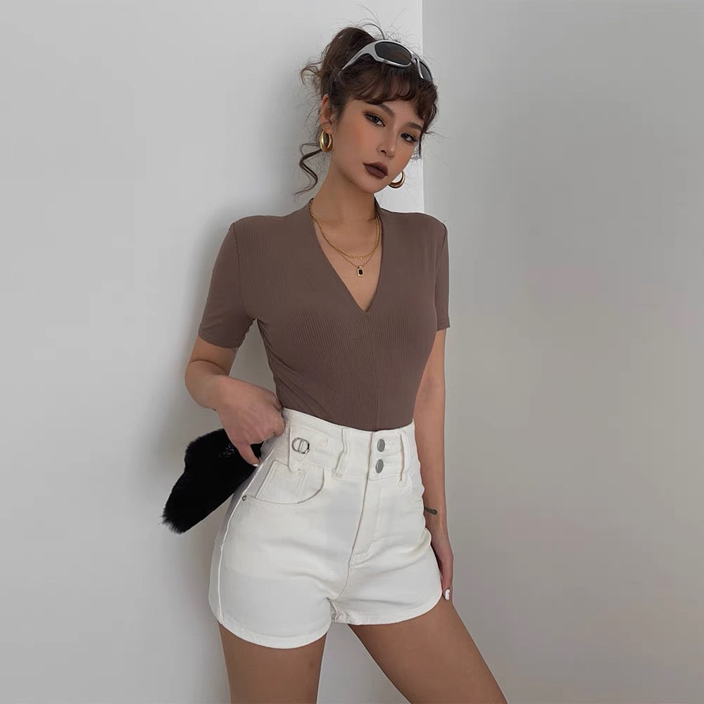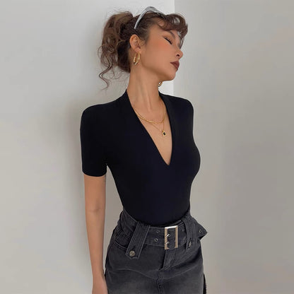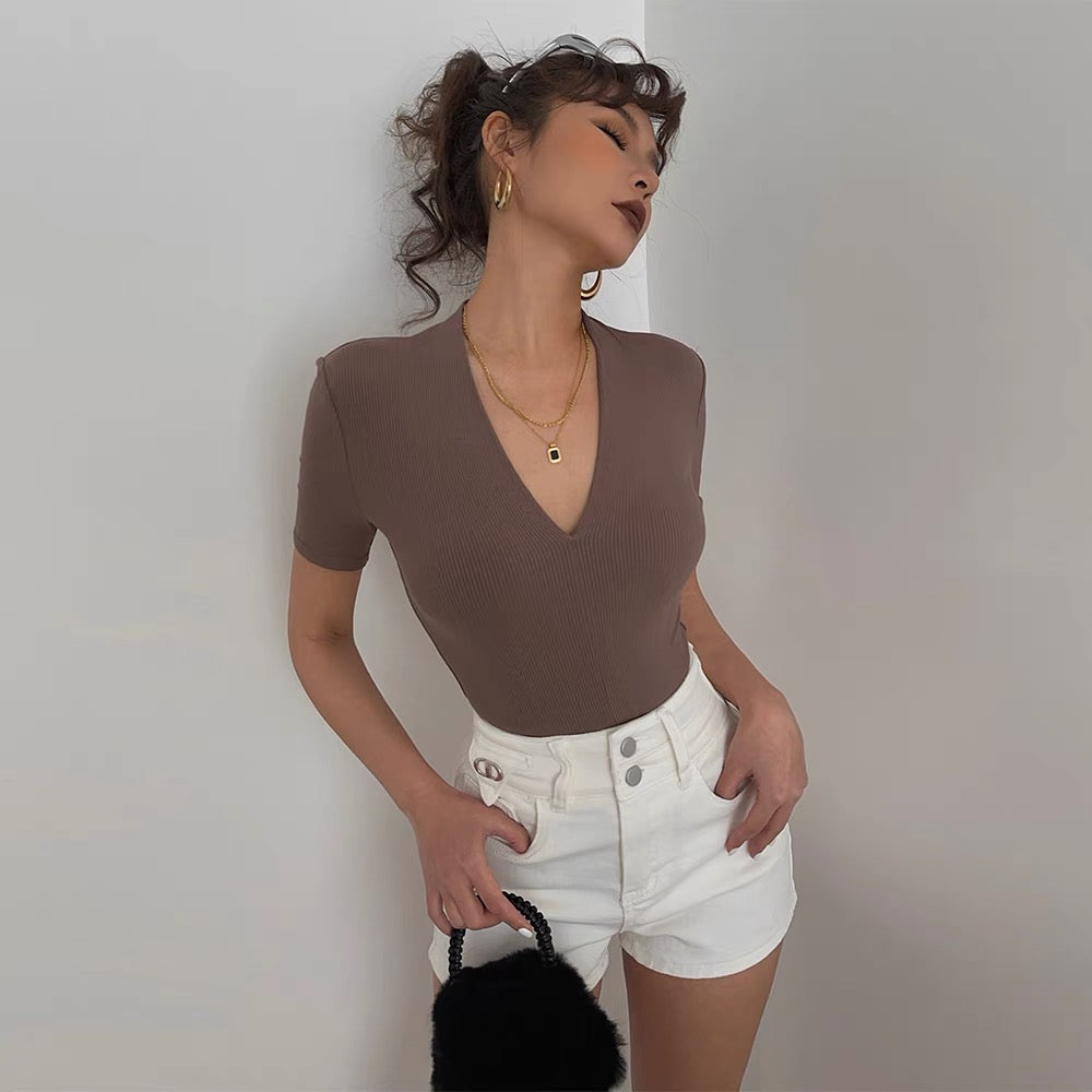 Homemade high elastic super thin sexy V-neck exposed collarbone short-sleeved T hot girl bottoming shirt hot summer must