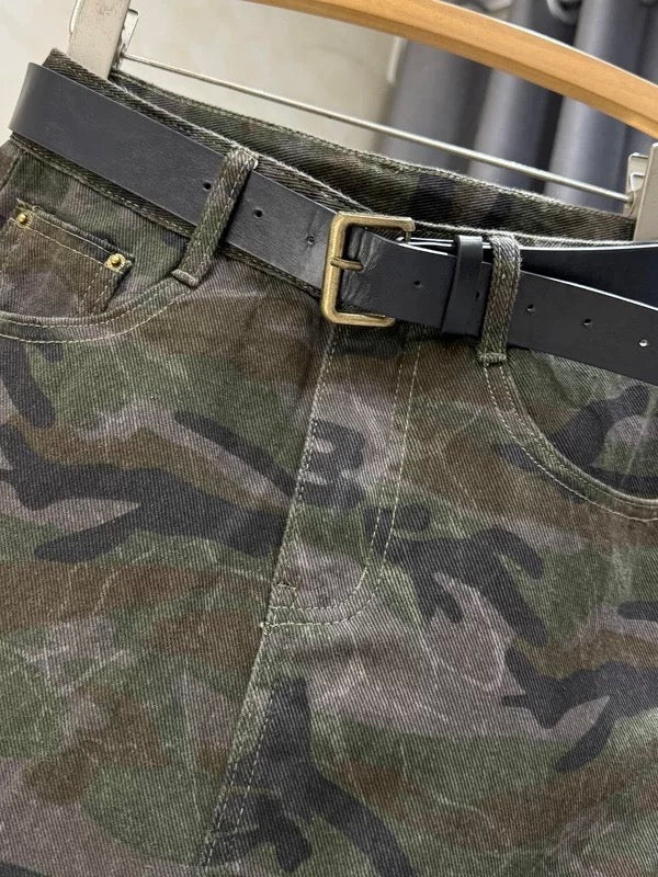 Korean retro sexy camouflage irregular denim midi skirt, women's high-waisted slimming workwear long skirt