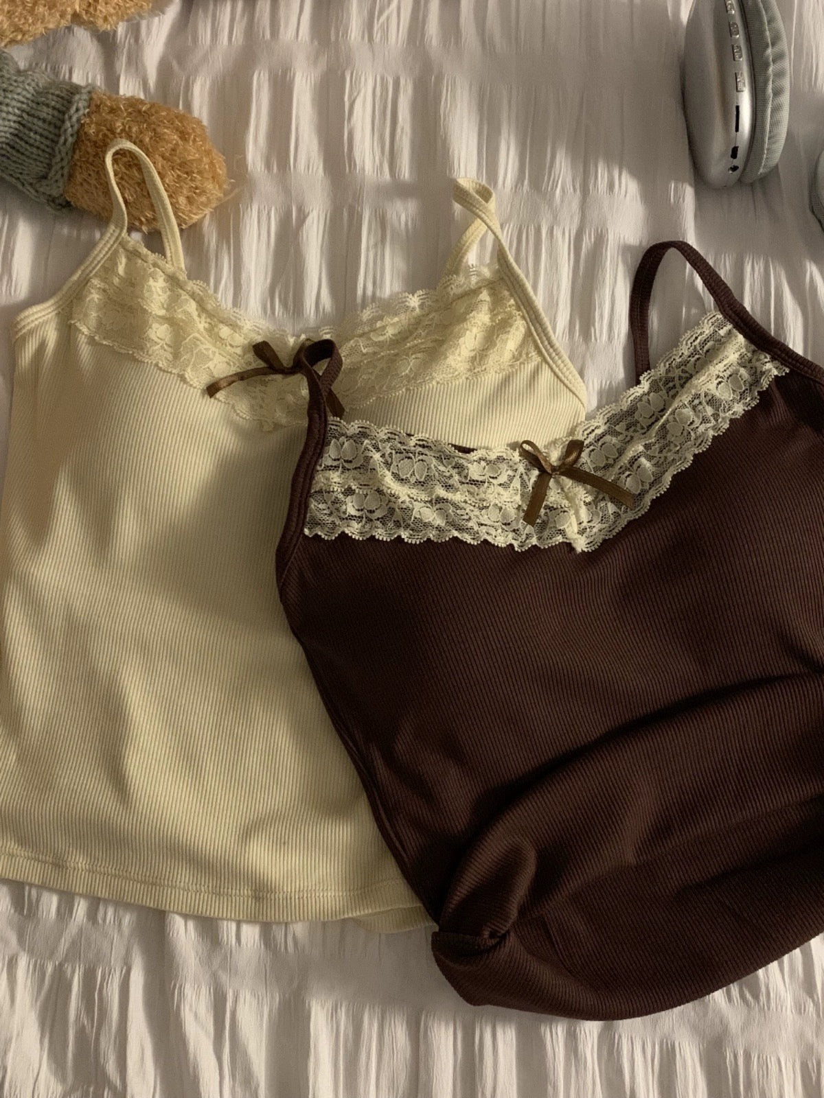 kumikumi pure lust style lace stitching bow camisole women's early spring short slim fit top with breast pads