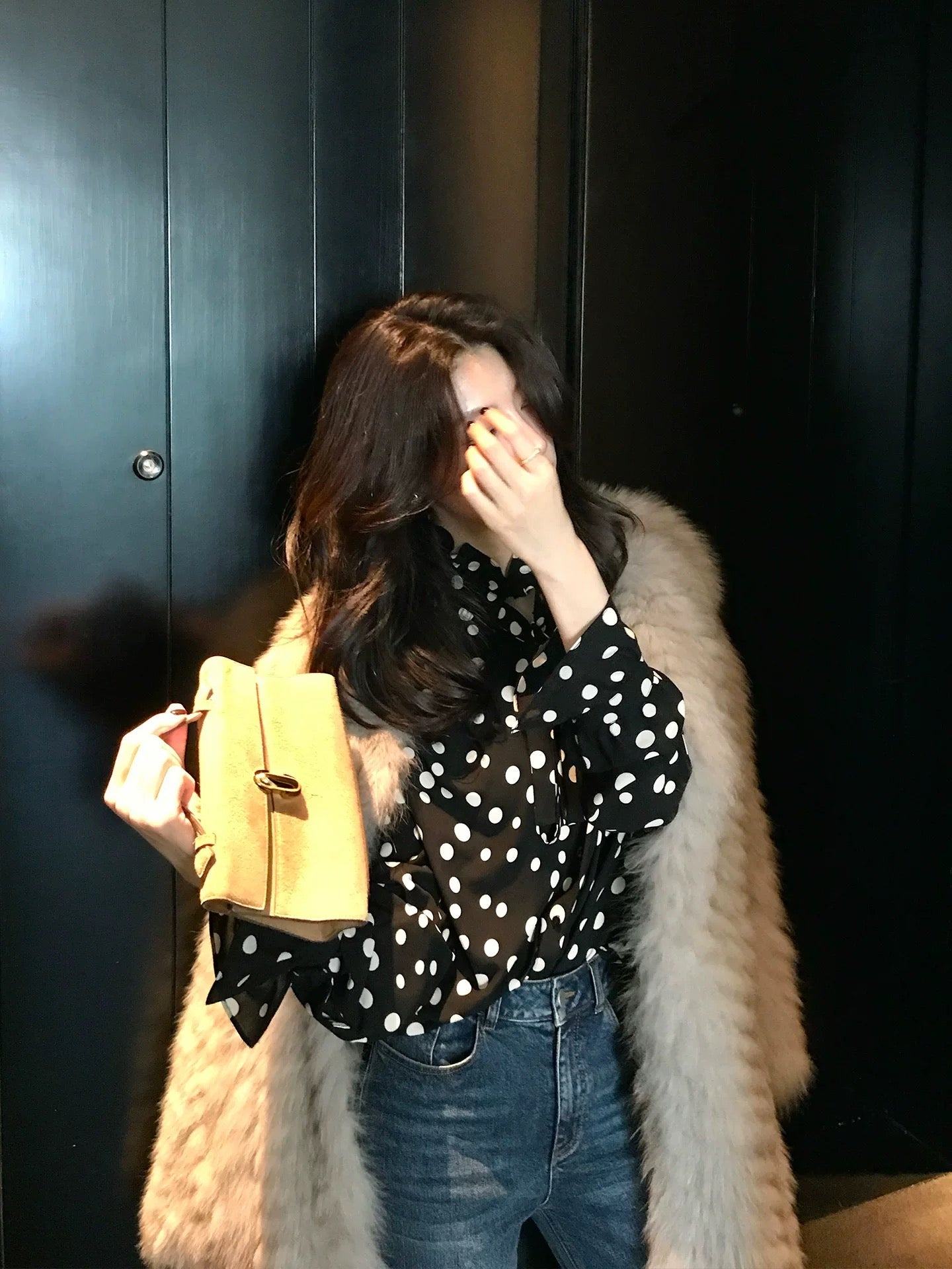 Long Xier, a niche design, featuring a gentle polka dot print lace shirt with a flowing collar, perfect for wearing outside. J380