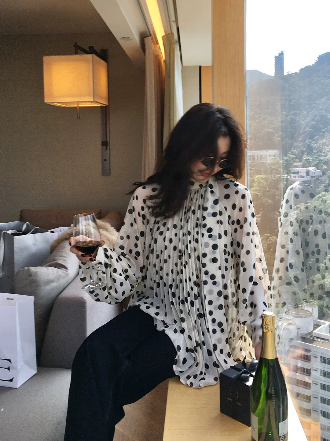Longxier Black Polka Dot Print Chiffon Blouse for Women, Loose Fit, Pleated Design, Flattering Long Sleeve Top, K007