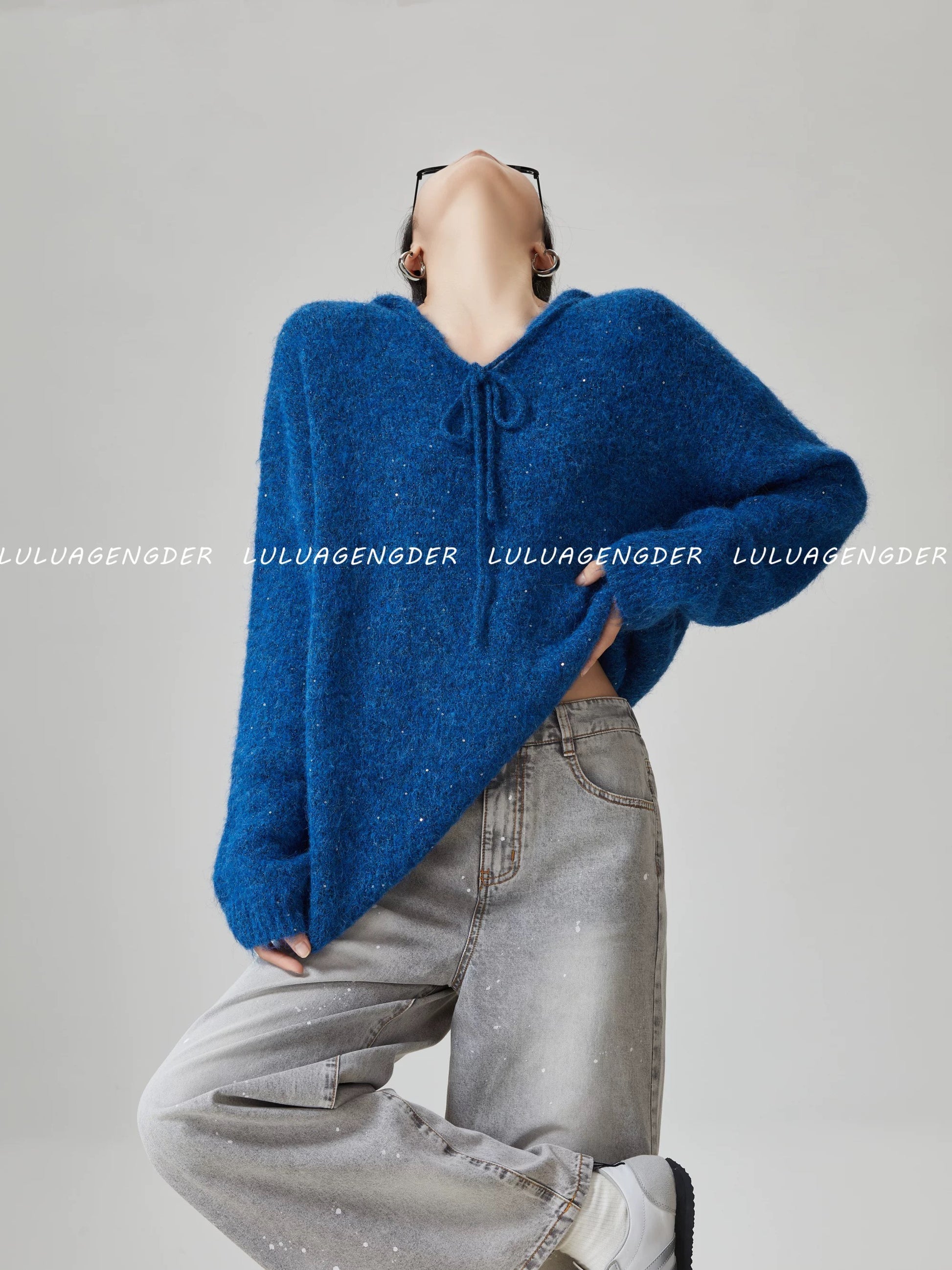 Lulu's style, relaxed fit, slimming sequined hooded sweater, women's autumn/winter new niche minimalist long-sleeved knitwear.