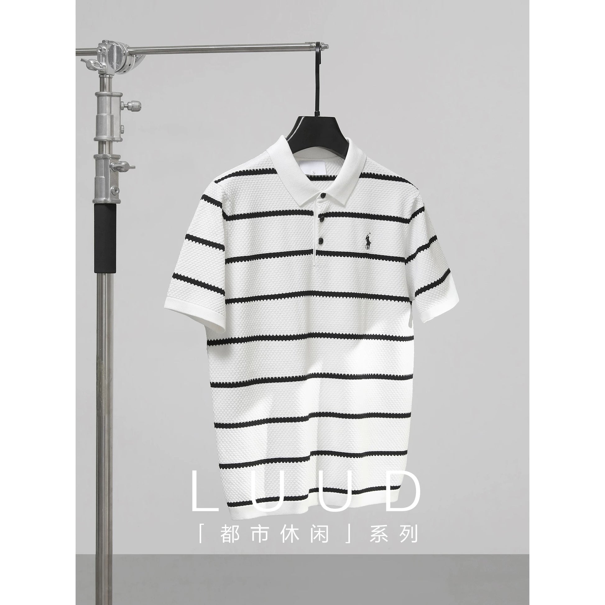 LUUD black and white striped colorblock polo shirt men's honeycomb texture slim fit T-shirt casual lapel knitted T-shirt