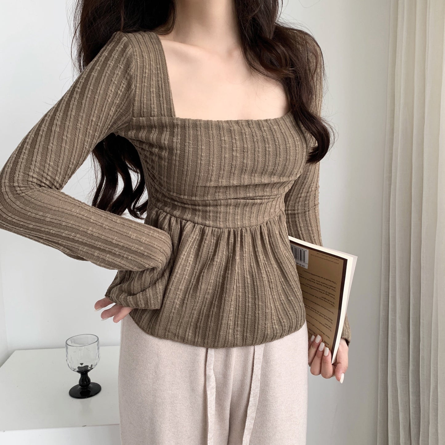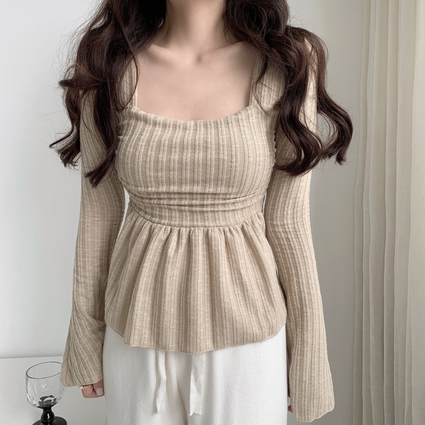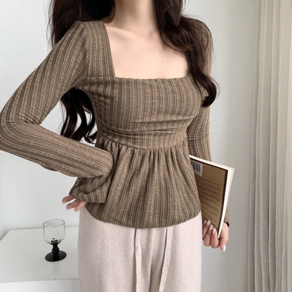 Mimo dk sweet, gentle and cute wind square collar trumpet sleeves fluffy hem cover small belly show chest top t-shirt female