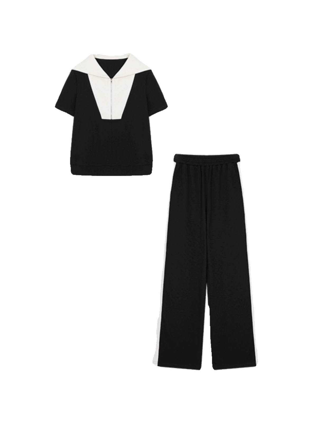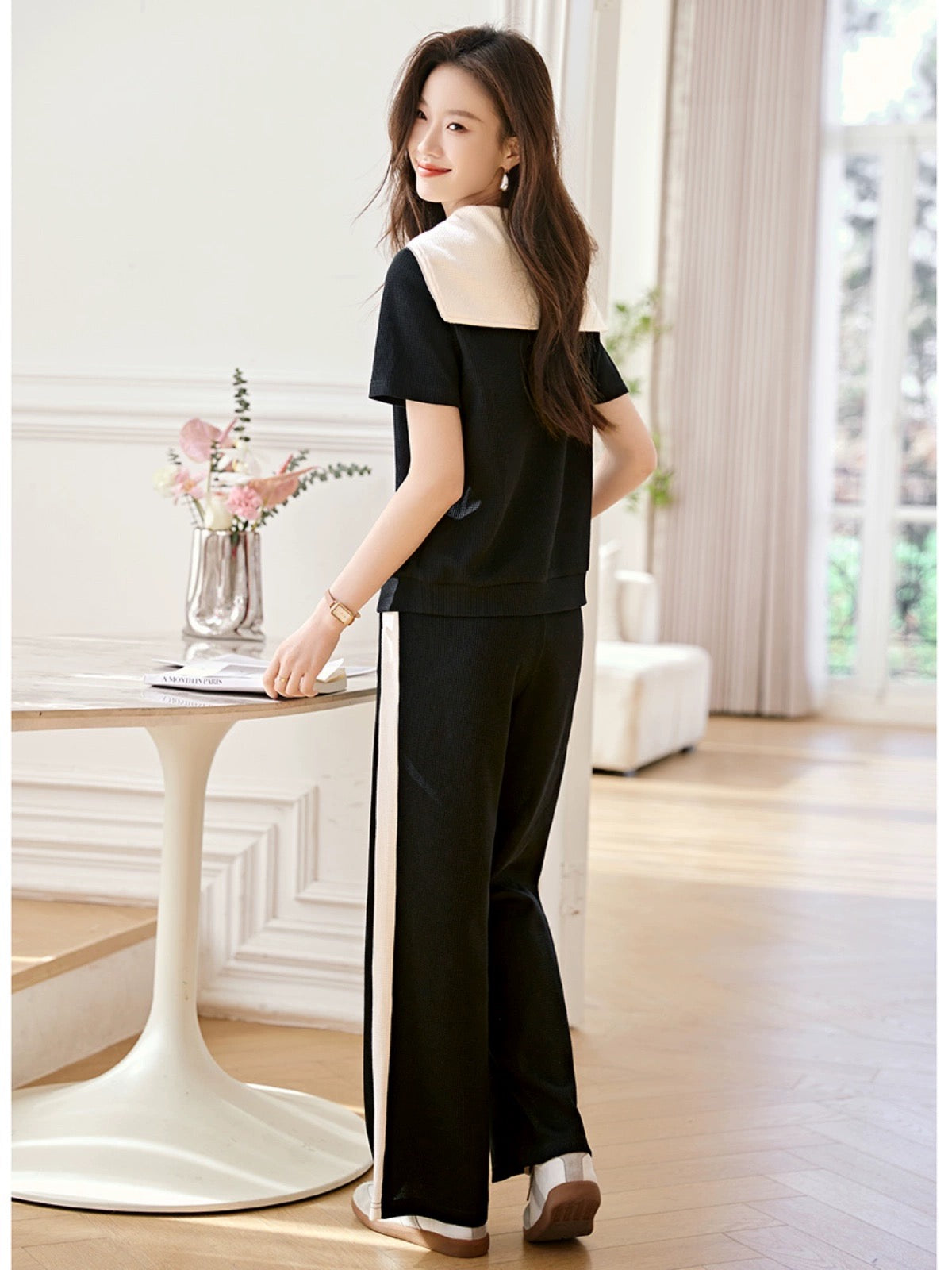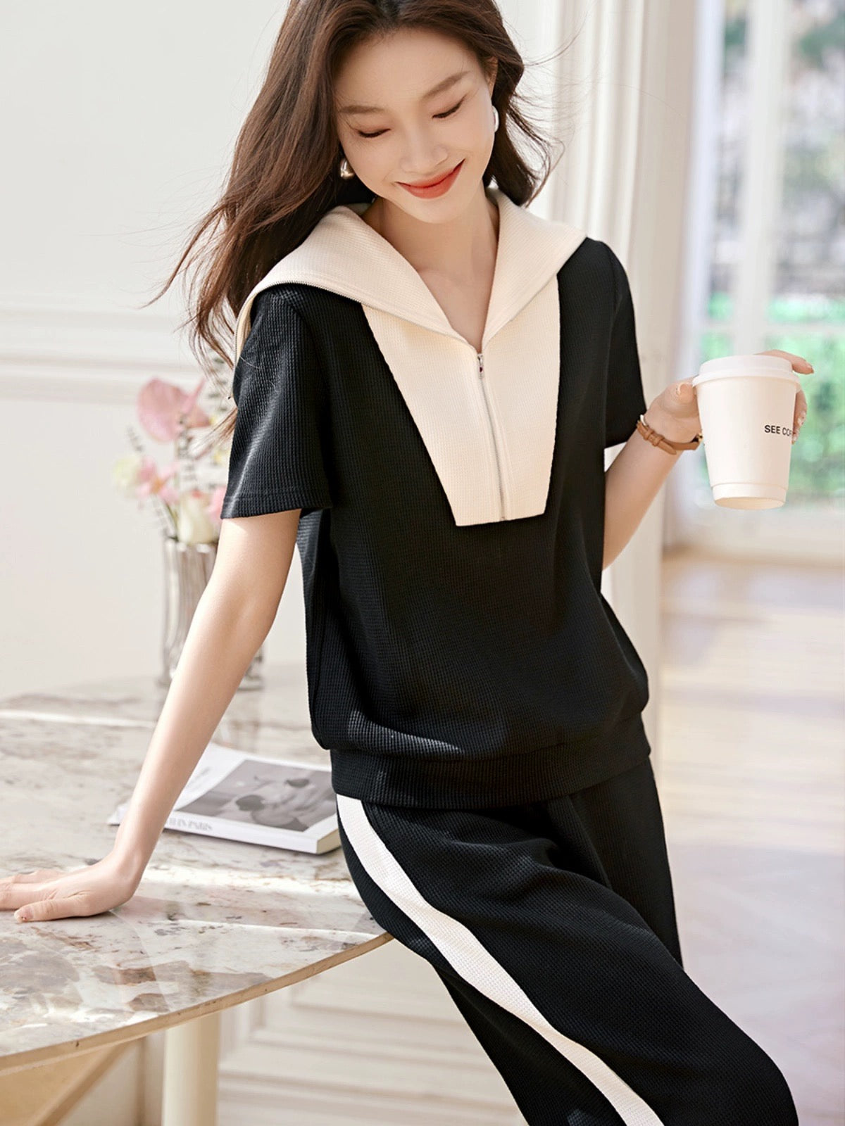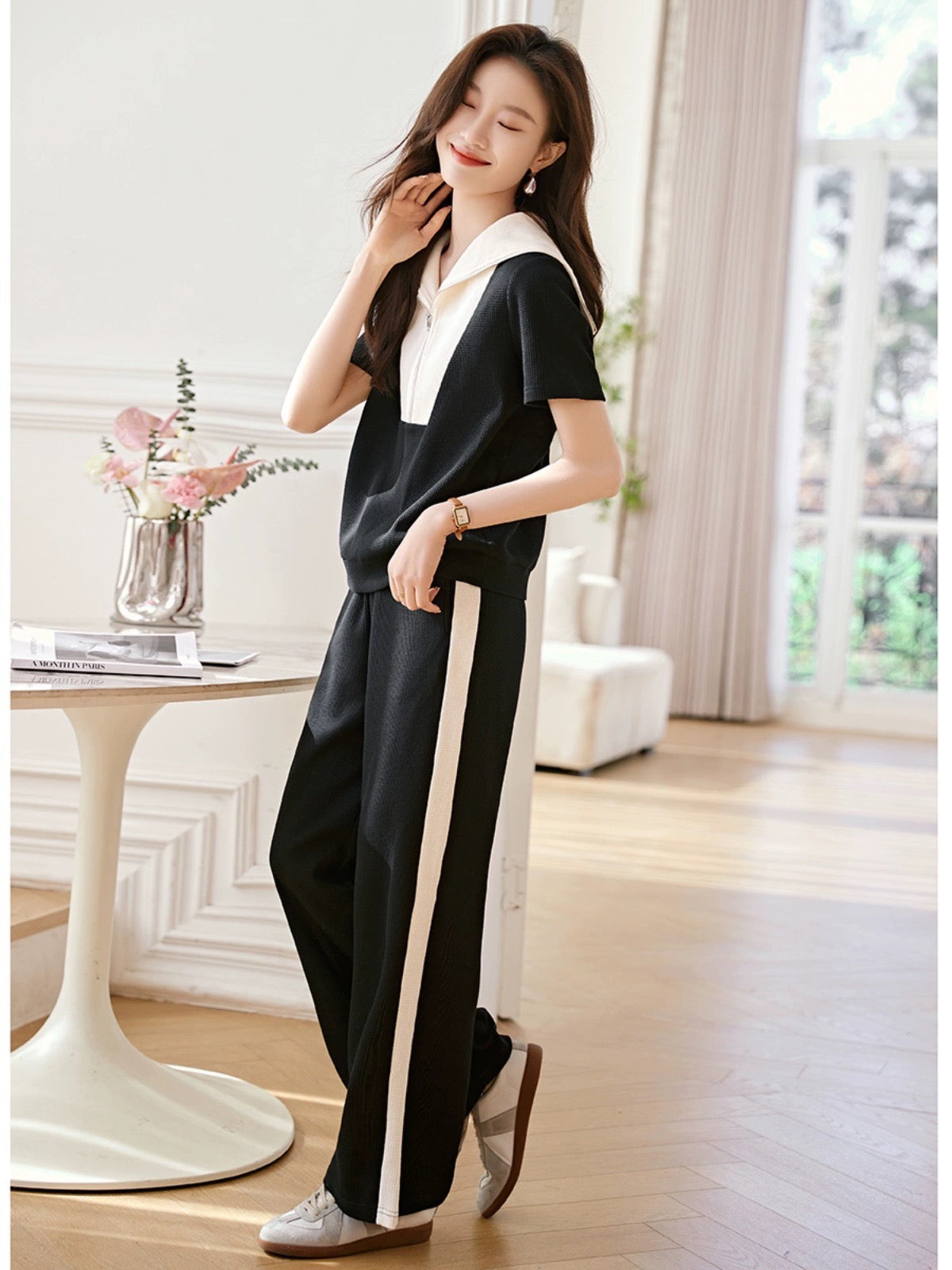 Mohan Yimei Light Urban Casual Suit 2024 Summer New Black and White Contrast Color Casual Slim Sports Suit for Women