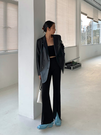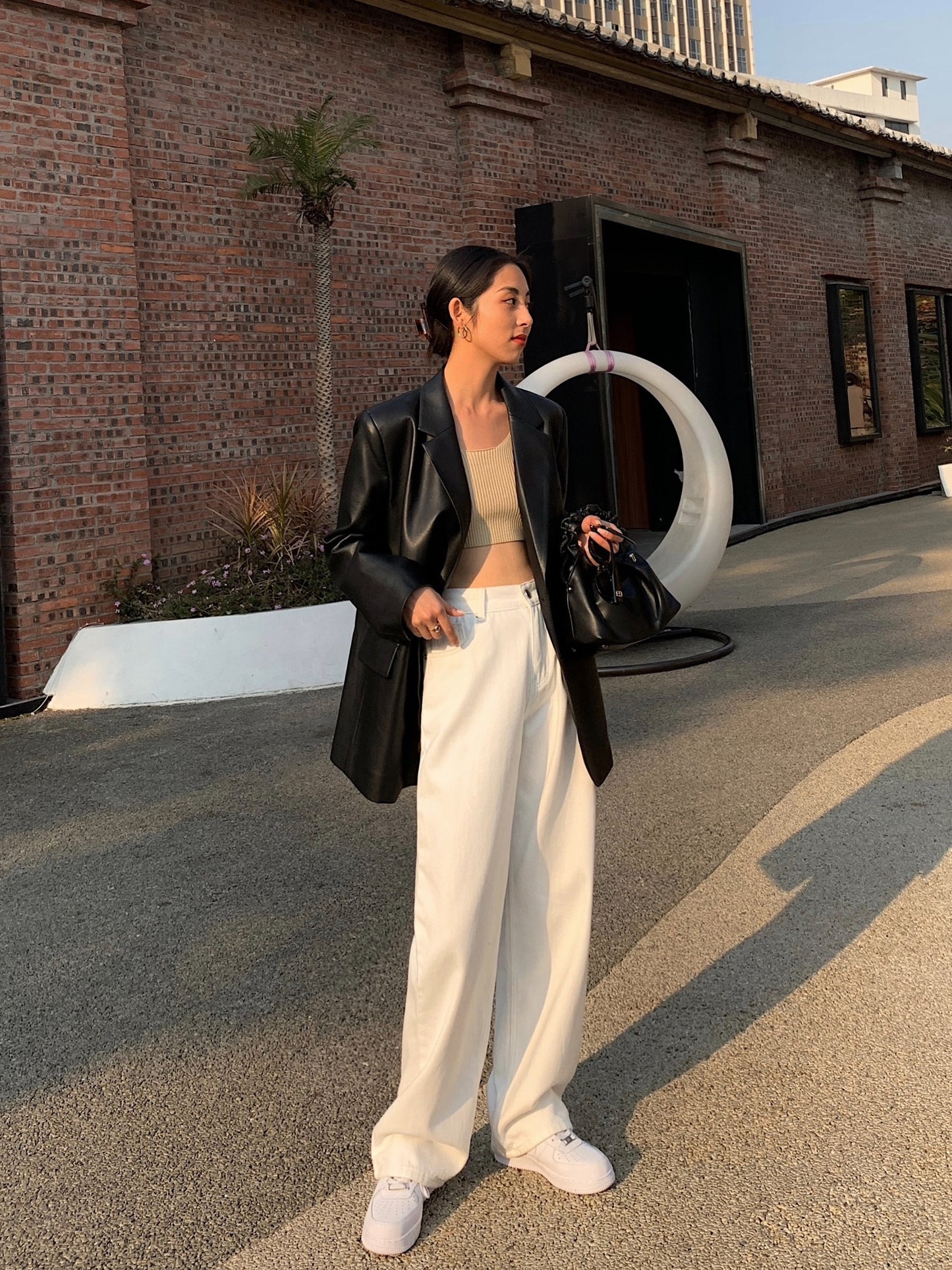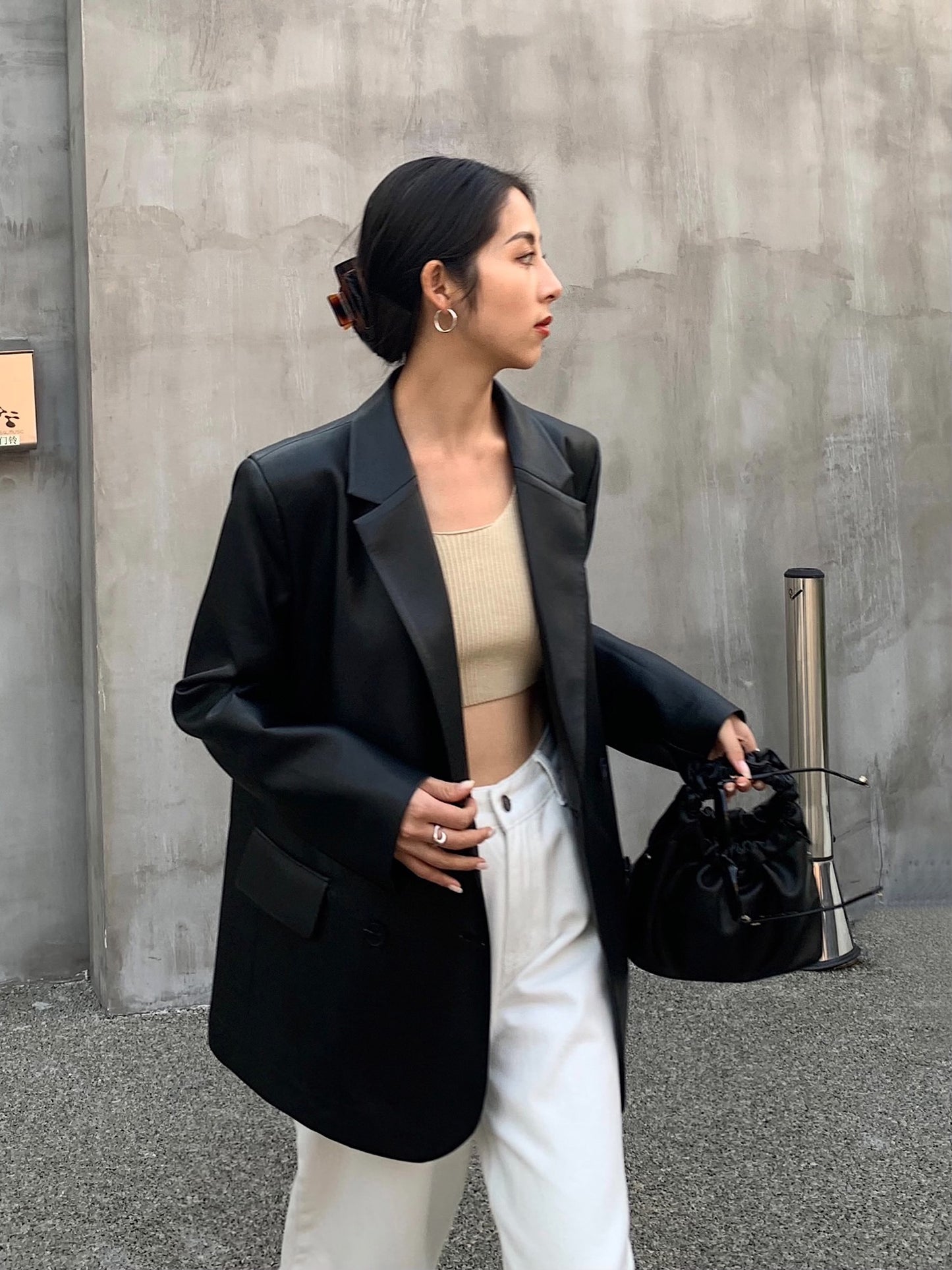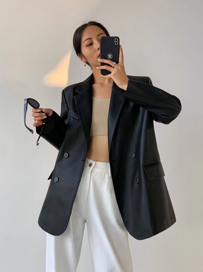 NEVA HU black suit leather jacket female 2023 new PU leather high-end fried street loose casual suit