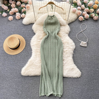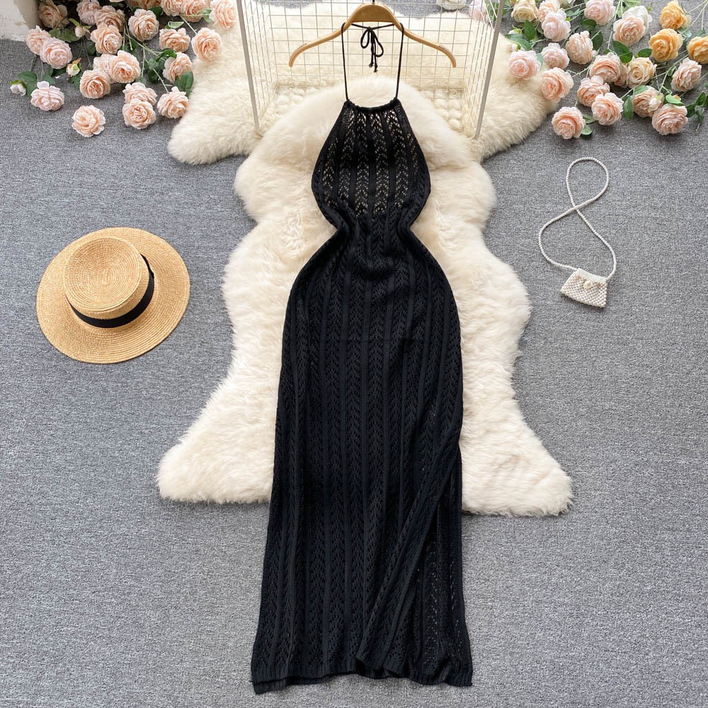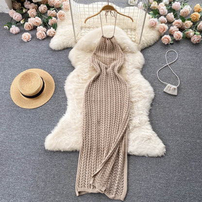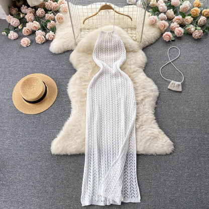 Niche design high-end socialite temperament hanging neck sleeveless hollow knitted dress female slim slit holiday skirt
