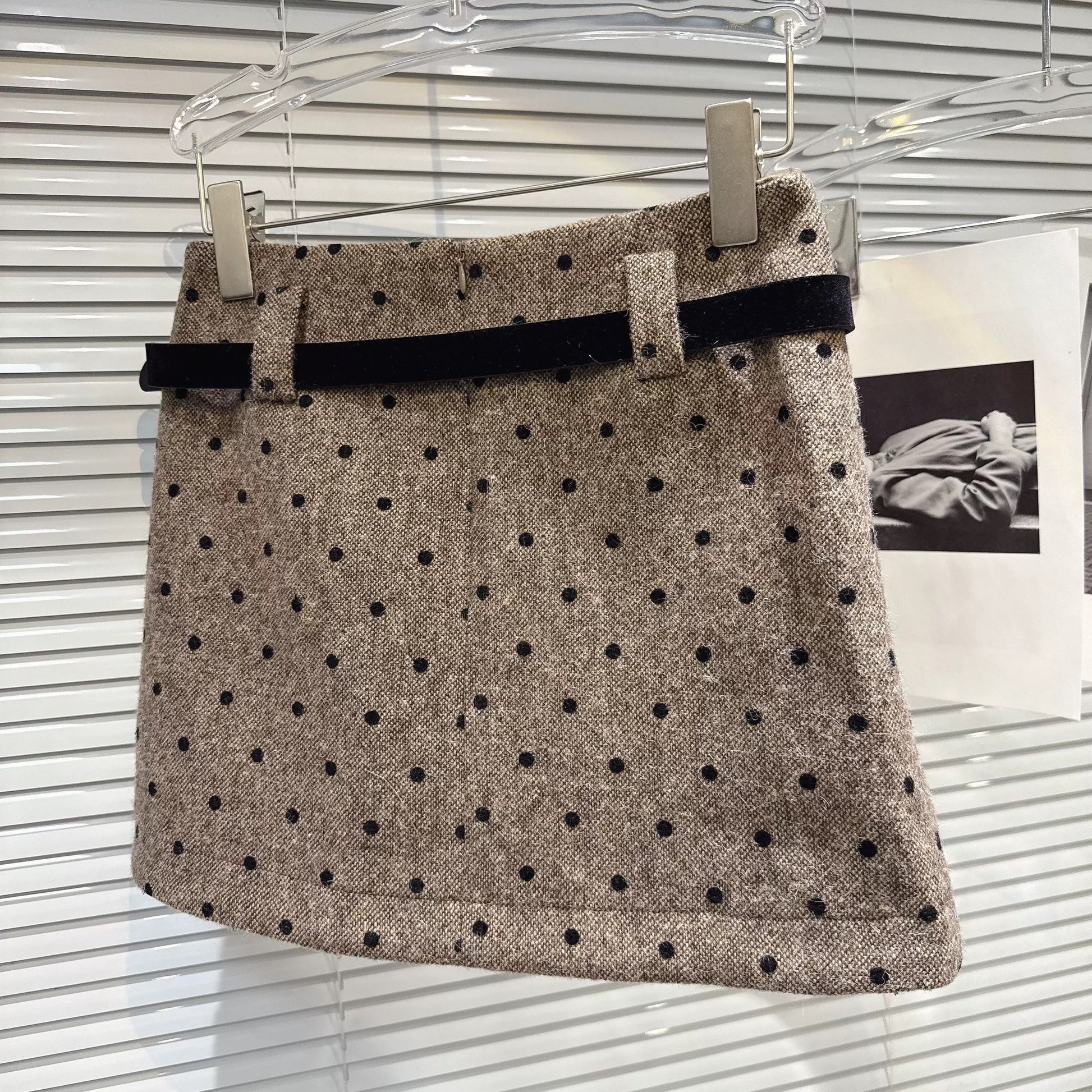 Popular online style, 2025 winter new arrival, Chanel-inspired polka dot wool mini skirt, suede waist bag and belt, A-line skirt.