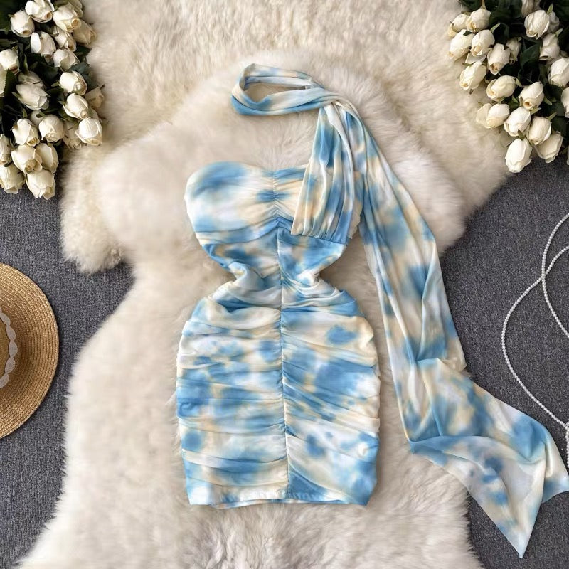 Pure Desire Sexy Short Skirt Women's Halter Neck Ribbon Tie-Dye Printing Folds Waist Slim Thin Temperament Package Hips Tube Top Dress