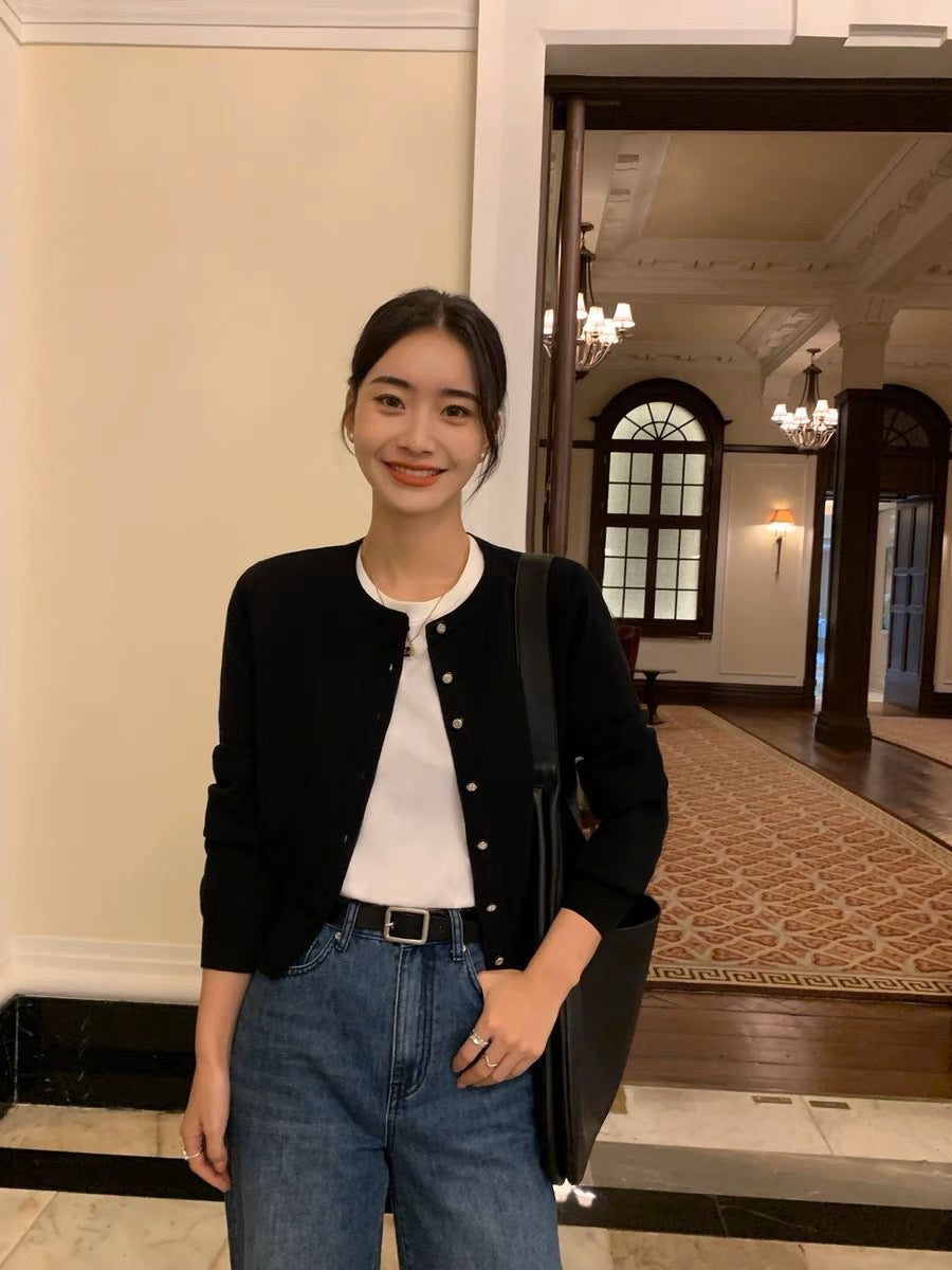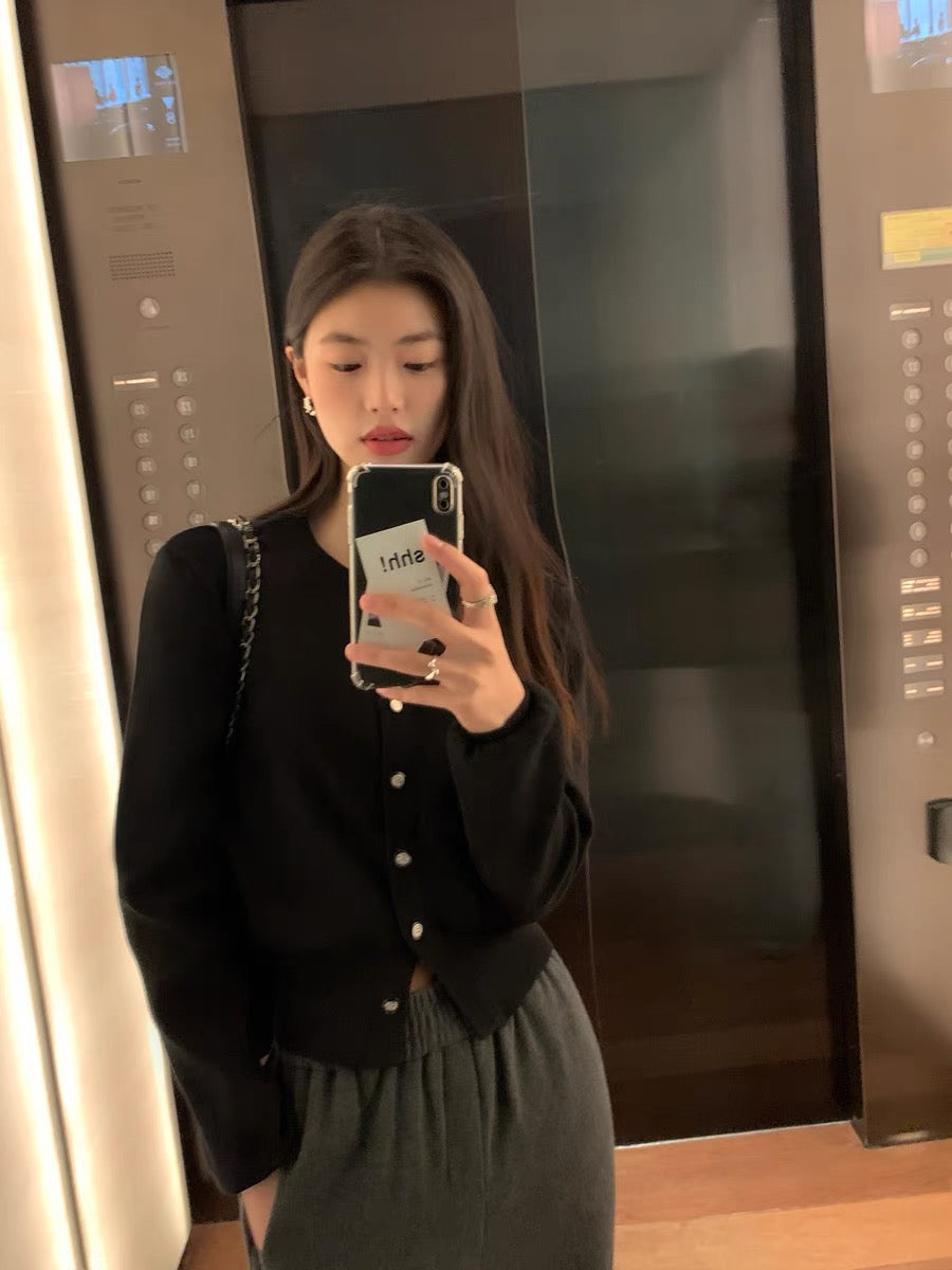 pusumede black knitted cardigan jacket for women with slim design and niche retro round neck short top