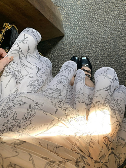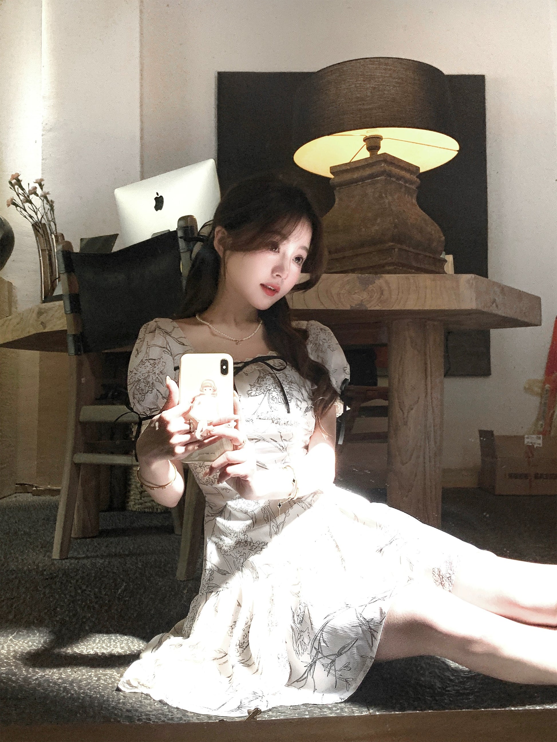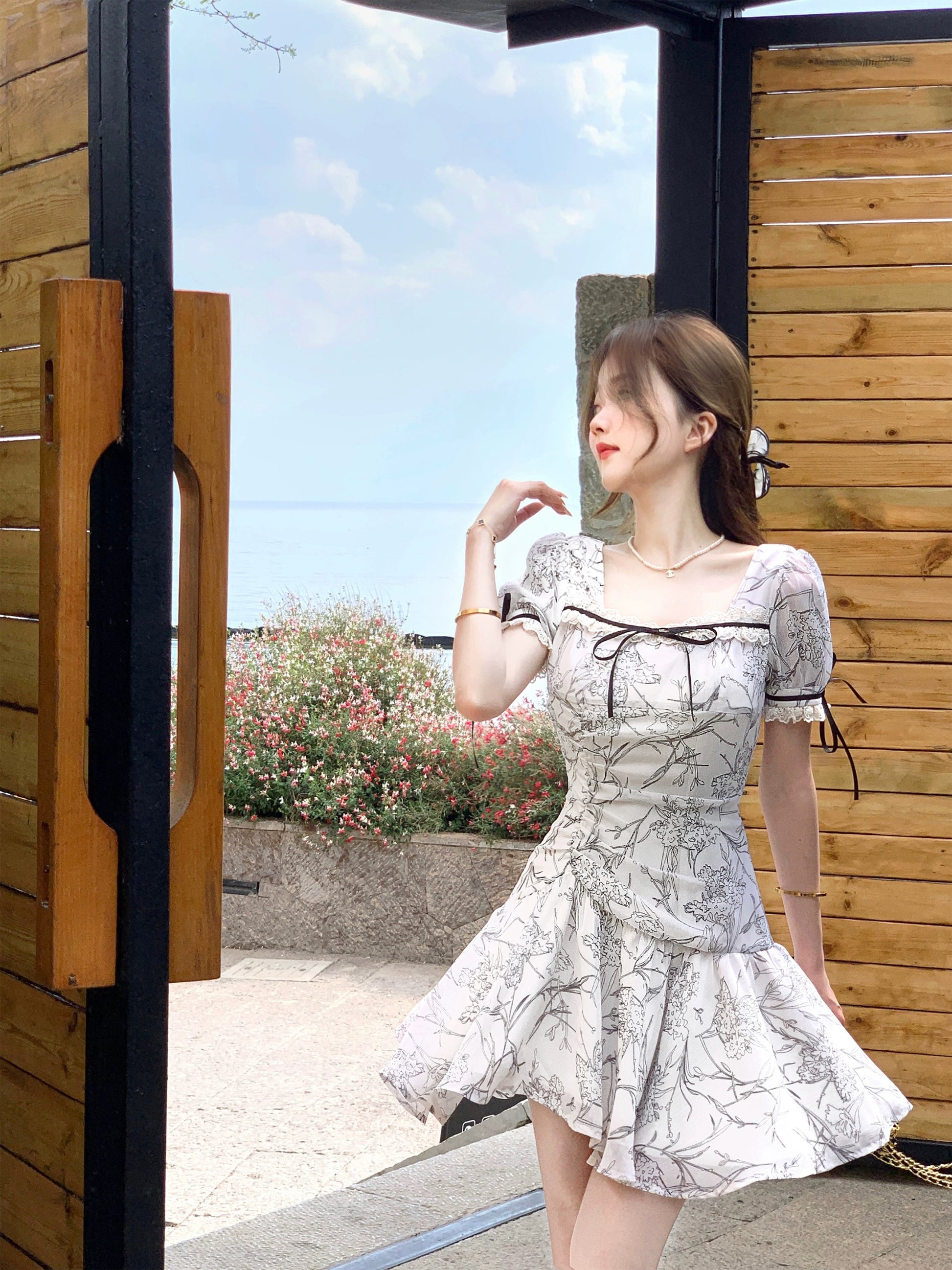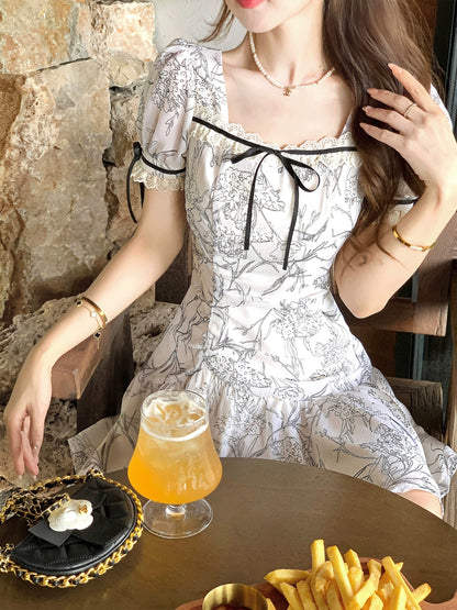 Q Girl's Shidai Ink/New Chinese Style National Style Square Neck Dress Women's 2024 Summer Retro Temperament Floral Skirt