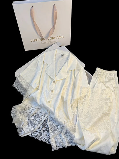 Qianjinfeng lace splicing high-grade ice silk pajamas for women sweet short-sleeved trousers Chinese jacquard home clothes suit