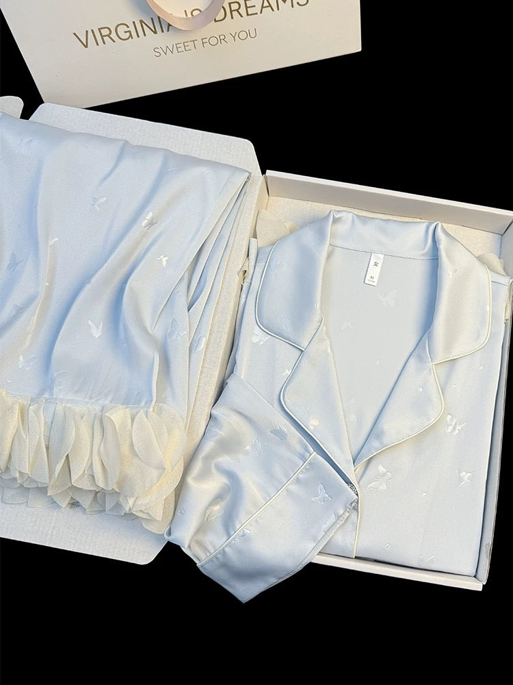 Qianjinfeng new style ice silk pajamas for women in spring and autumn long sleeves sweet butterfly lace can be worn outside home clothes suit
