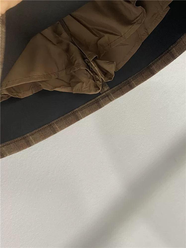 Retro brown wool plaid midi skirt for women, 2025 autumn/winter, preppy style, high-waisted, slimming A-line bodycon mini skirt.