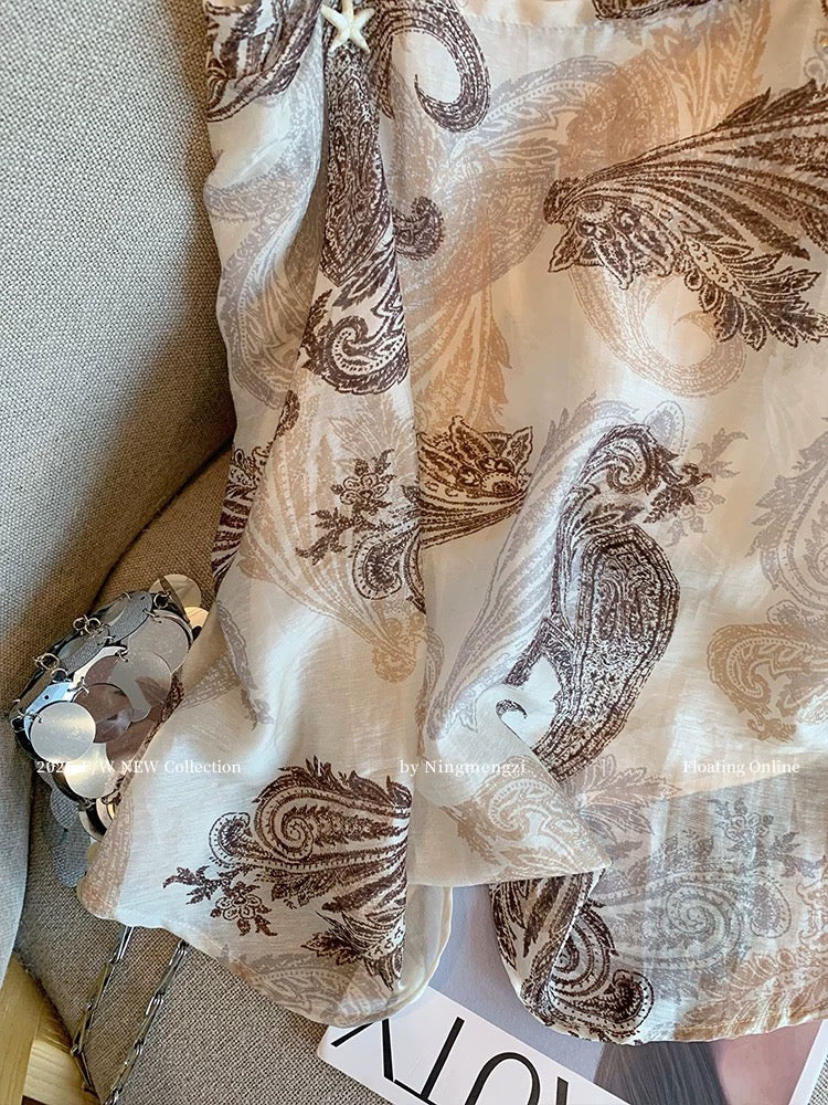 Retro-style printed beaded camisole for women, 2025 summer new style, elegant, slimming, and youthful top.