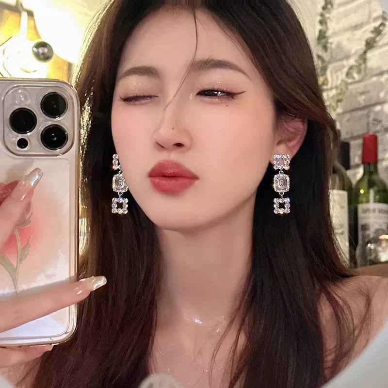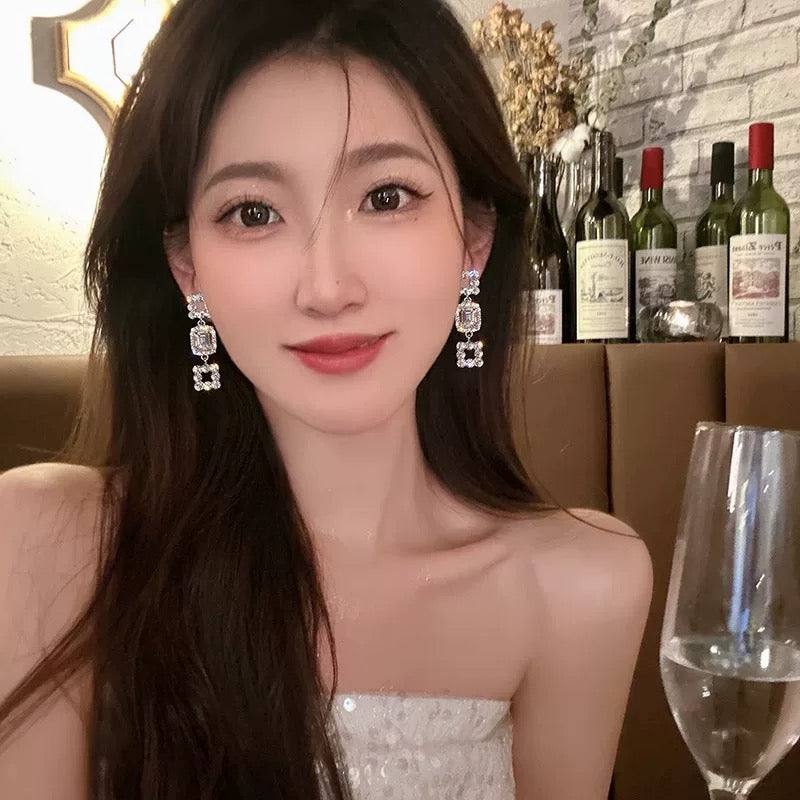 Rich lady! Flash Diamond Square 925 Silver Needle Earrings Unique Niche Design Earrings Women's High-end Earrings