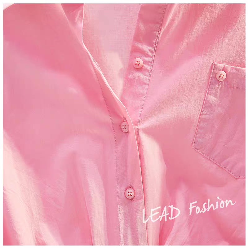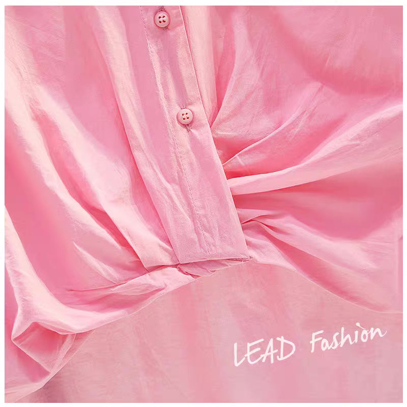 Rose red pleated pullover short-sleeved shirt women 2023 summer new Korean version single pocket casual literary shirt top