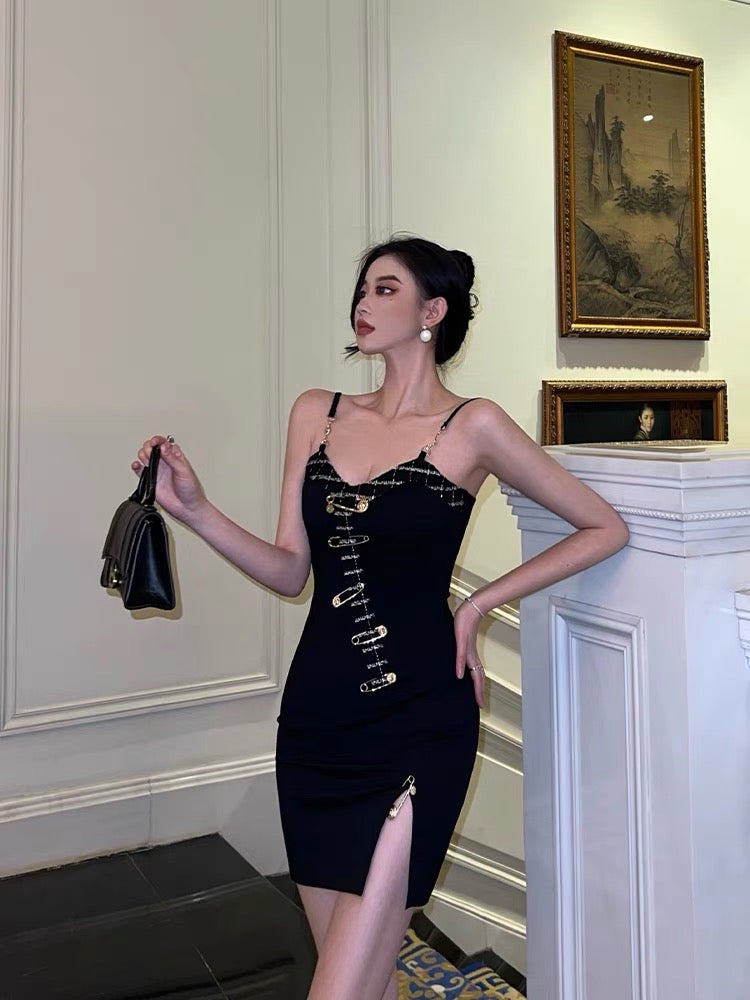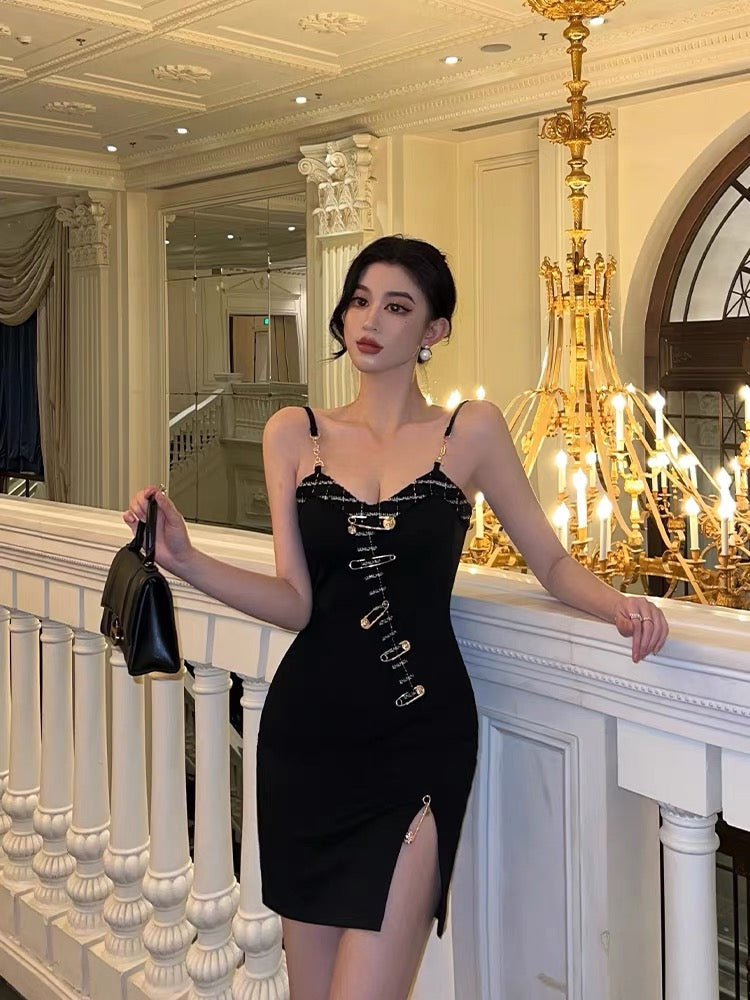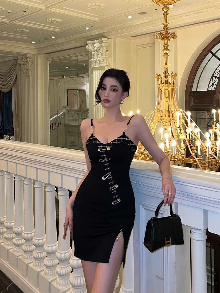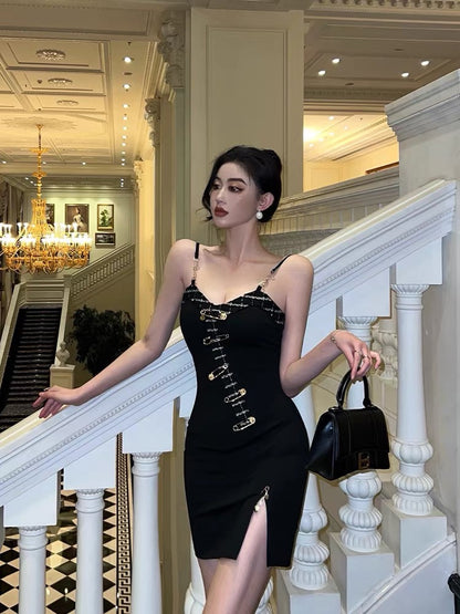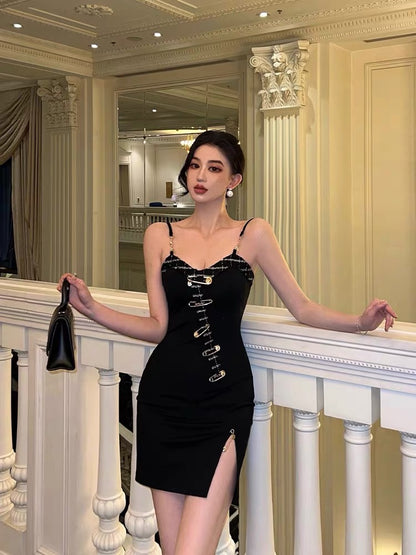 Sexy Buckle Sling Dress Women Summer Stunning Split Design Sensation Niche Hot Girl Slim Pack Hip Little Black Dress9281