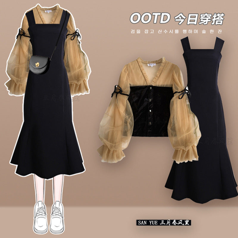 Spring and summer advanced black suspenders fishtail dress 2023 new French ladies puff sleeve shirt suit