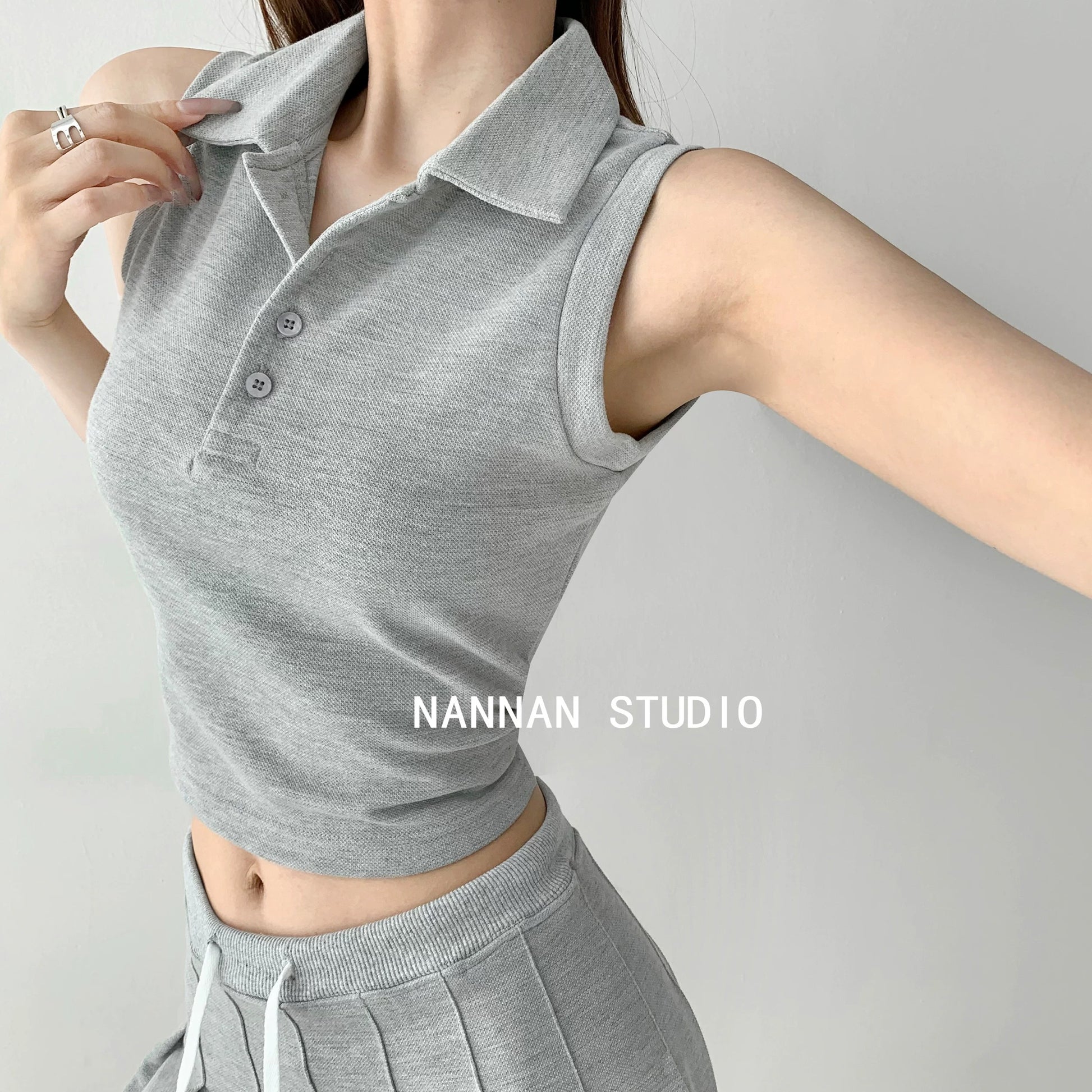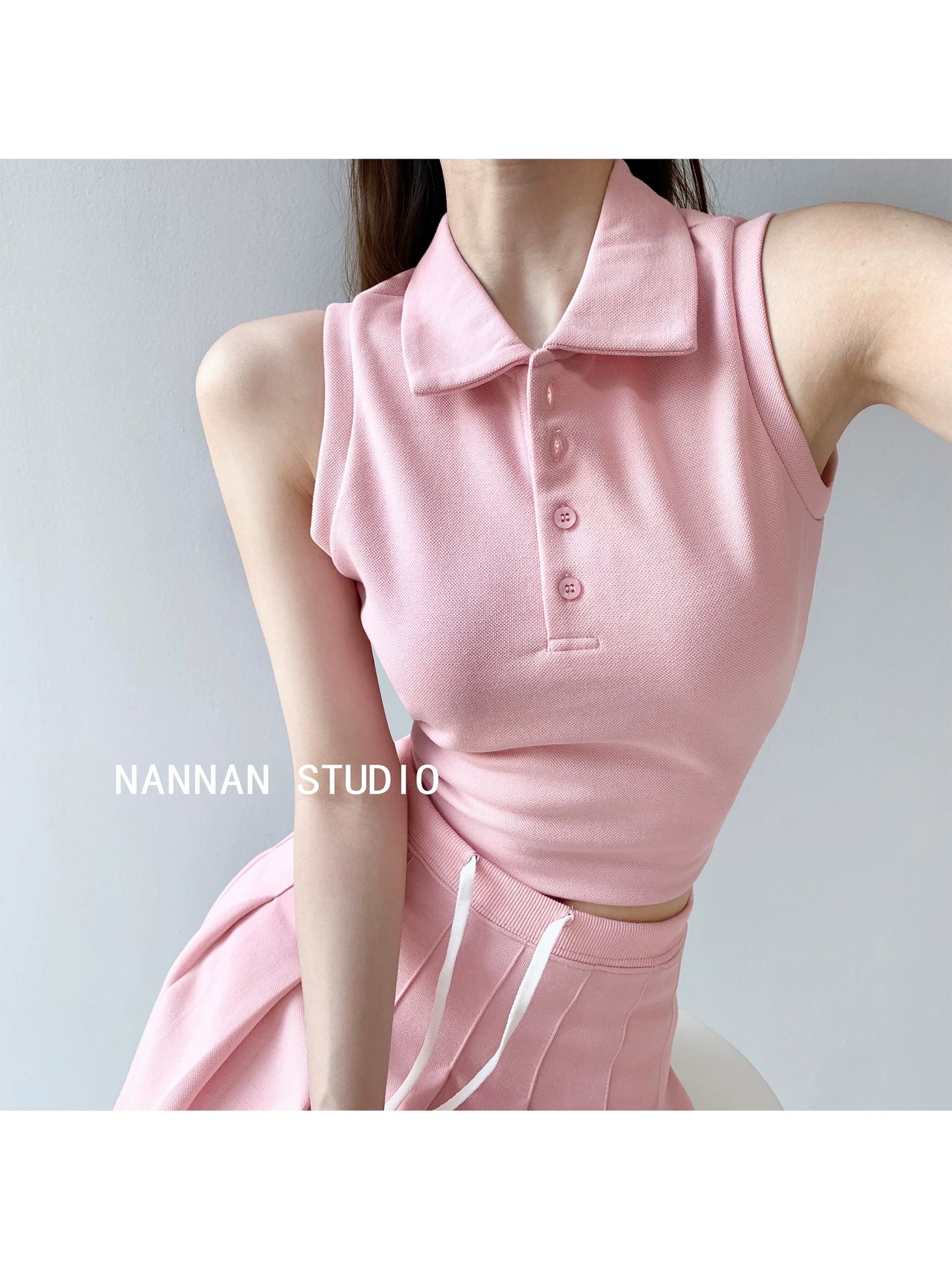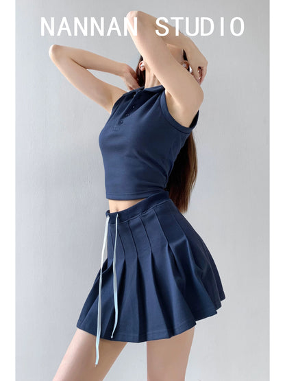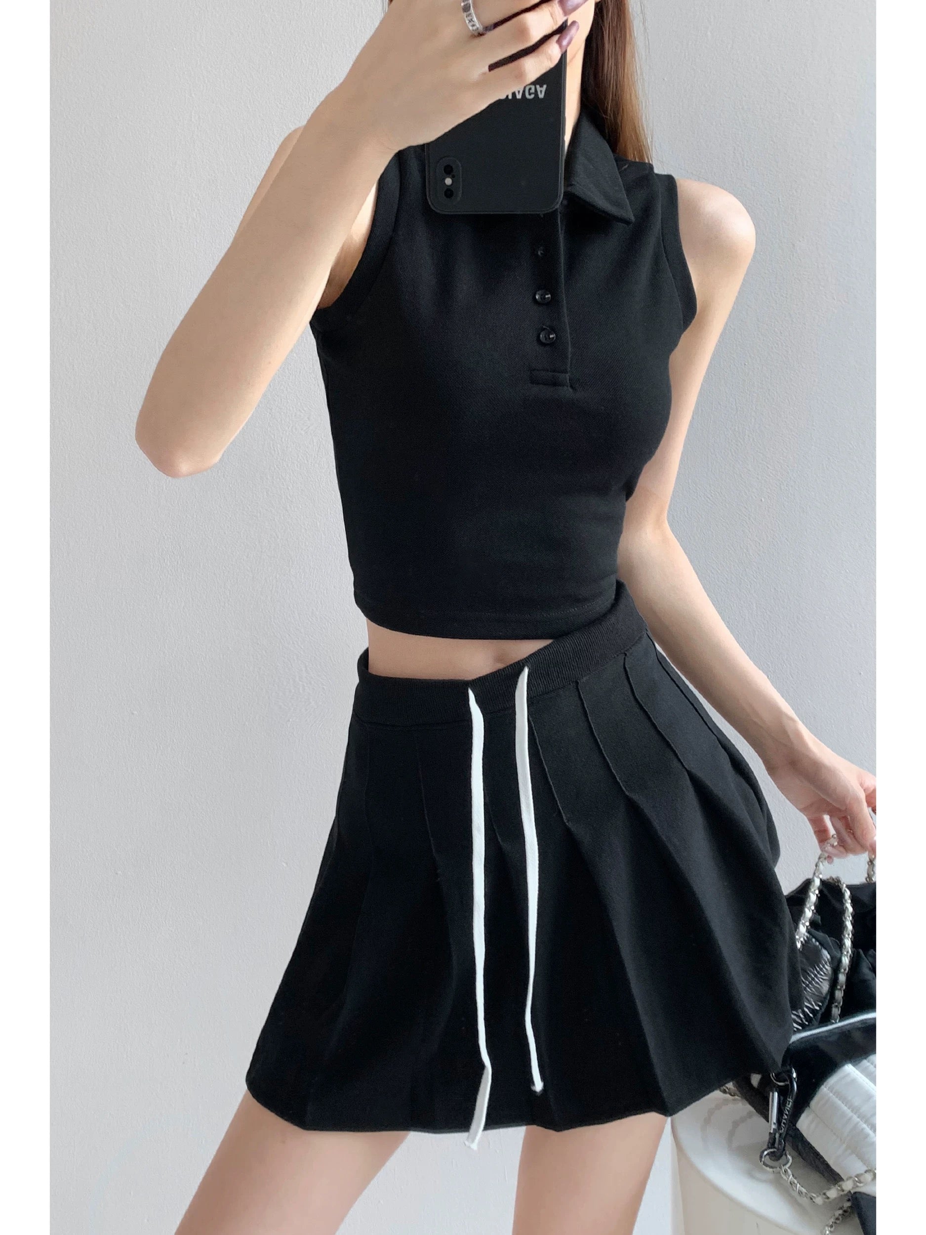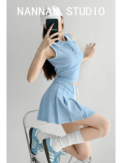 Summer rhythmic sports tennis style pleated skirt for women + sleeveless outer wear POLO collar bottoming vest two-piece set